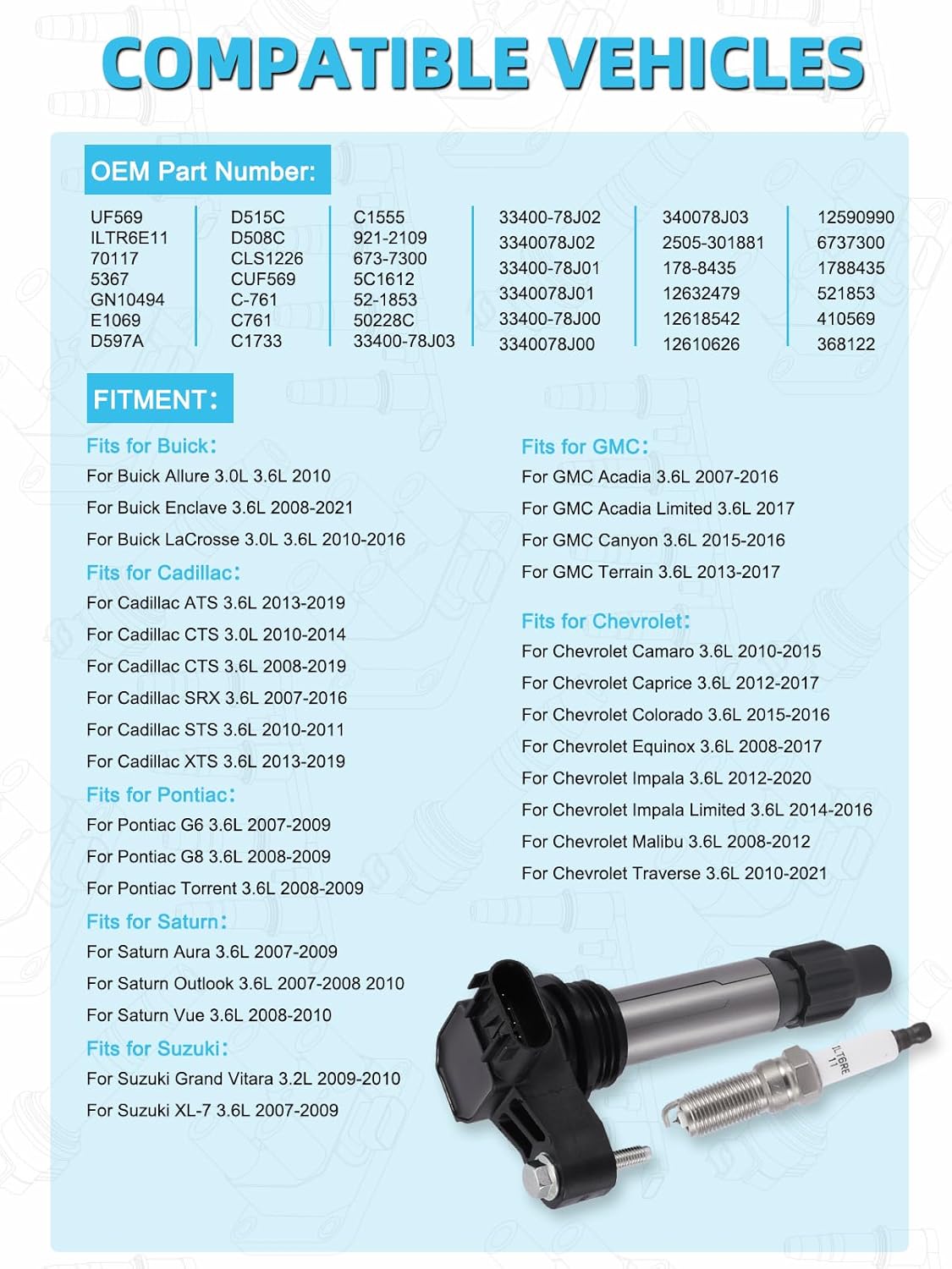 UF569 Ignition Coil 5367 Spark Plug For Buick Enclave LaCrosse,Cadillac ATS SRX STS,Chevy Camaro Caprice Equinox Impala Malibu Traverse,GMC Acadia Terrain,Pontiac,Saturn,Suzuki 2007-2021,6 PCS