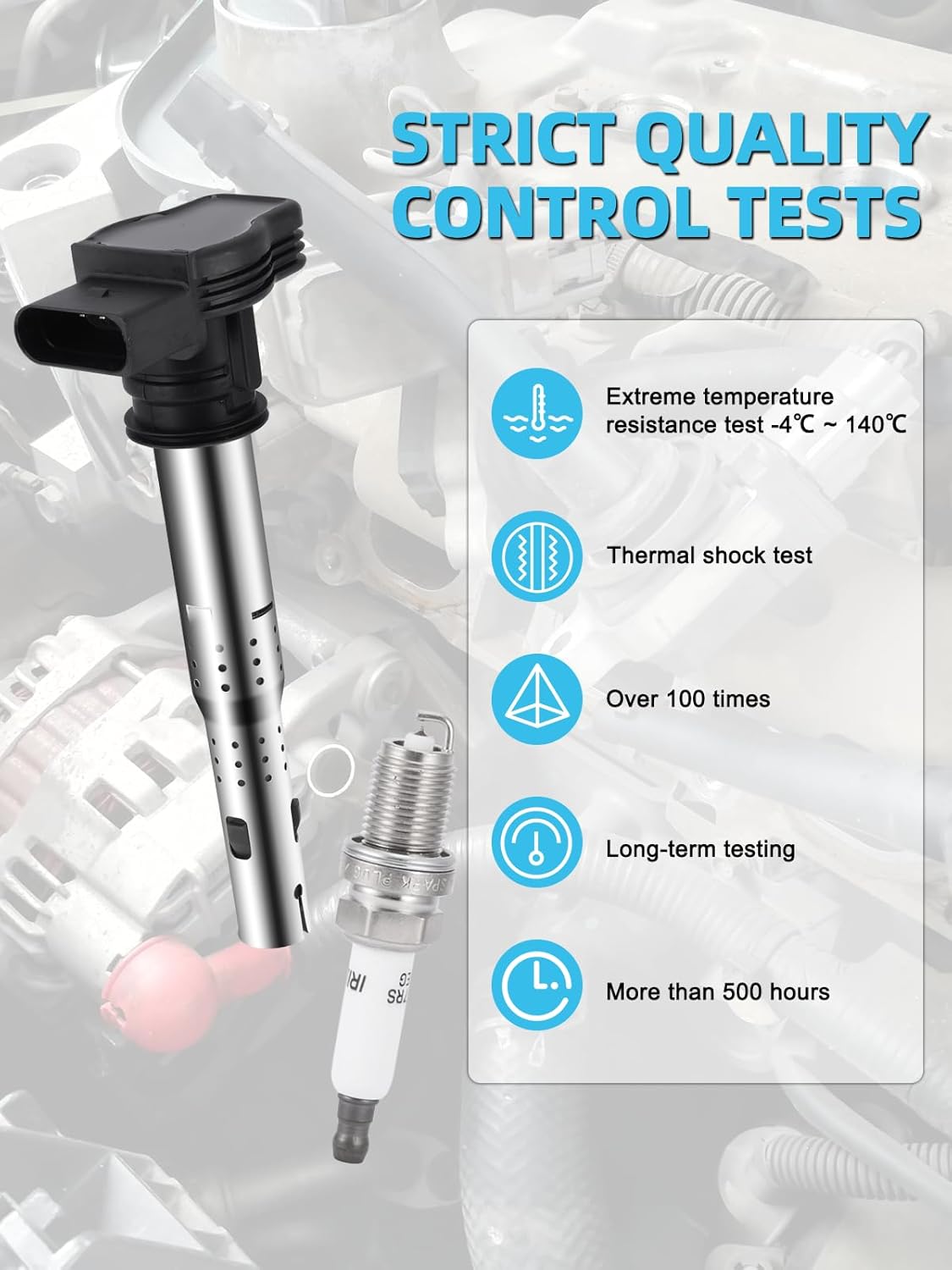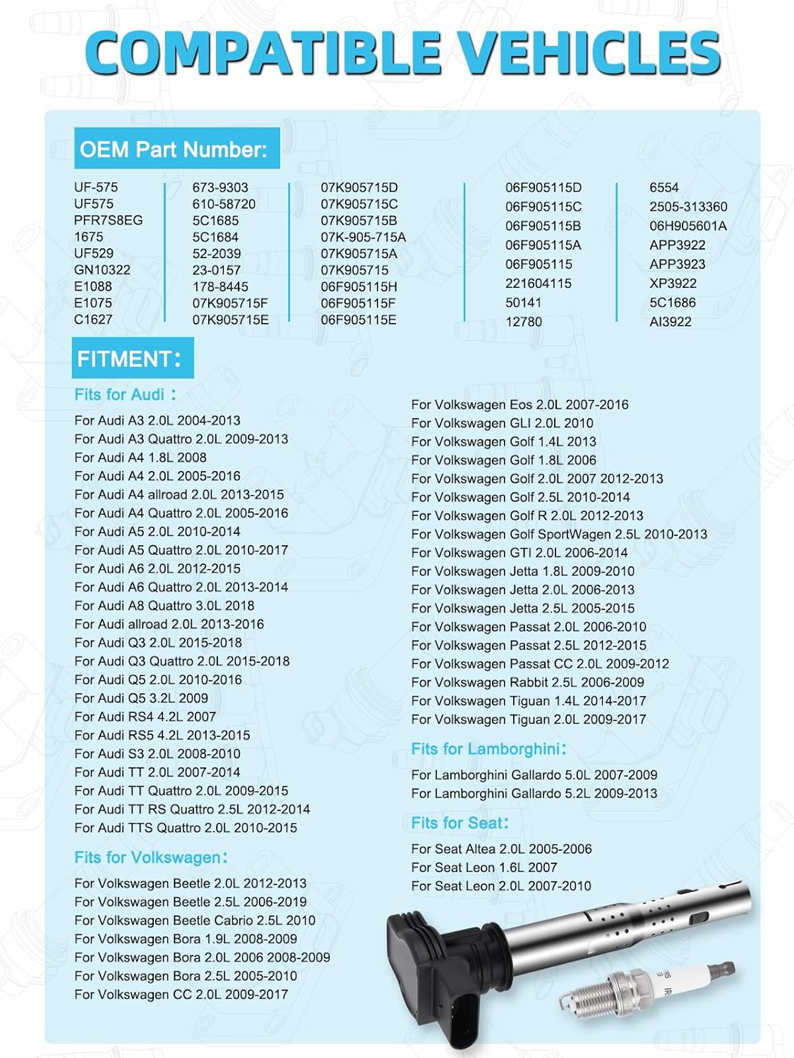 UF575 Ignition Coil Pack Spark Plug Iridium 4 PCS (2.0L 4.2L) 2004-2019 For Audi A3 A4 A5 A6 A8 Allroad Q3 Q5 RS4 RS5 TT,For VW Beetle CC Eos GLI Golf GTI Jetta Passat Rabbit