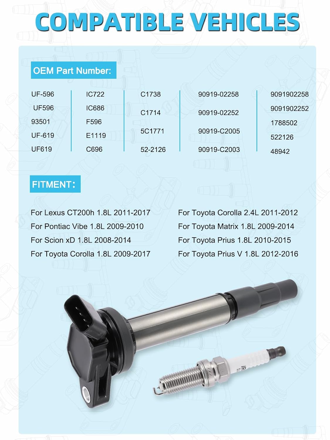 UF596 Ignition Coil Pack Spark Plug Iridium 4 PCS (1.8L) For 2009 2010 2011 Toyota Corolla Matrix Prius 2012 2013 2014 2015 2017 Lexus Scion IM XD Pontiac Vibe, UF619 90919-02258 C1714