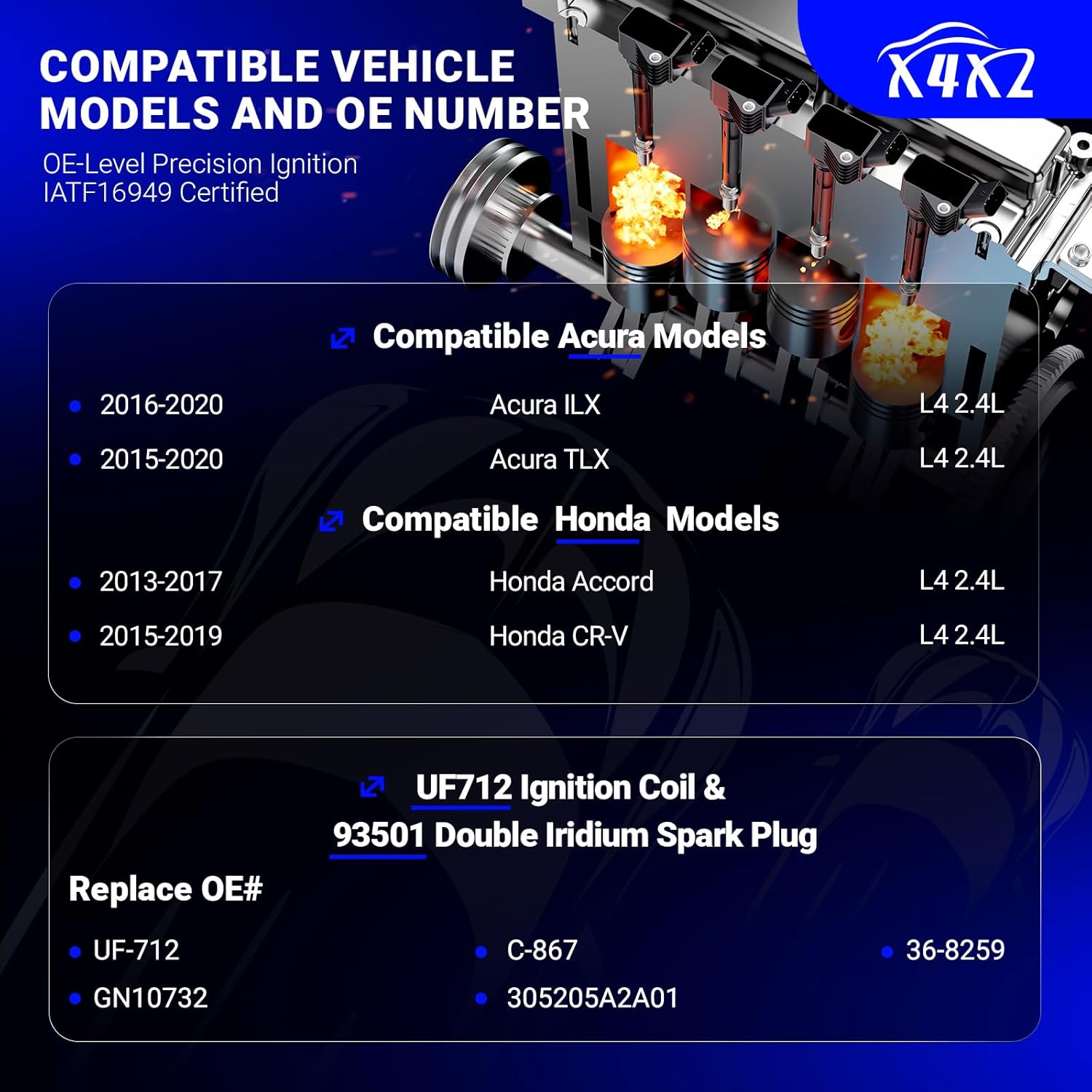 UF712 Ignition Coil & 93501 Double Iridium Spark Plug For 2013-2017 Honda Accord,2015-2019 CR-V /2015-2017 Acura TLX,2016-2020 Acura ILX L4 2.4L Replaces# GN10732, C-867, 305205A2A01, 36-8259