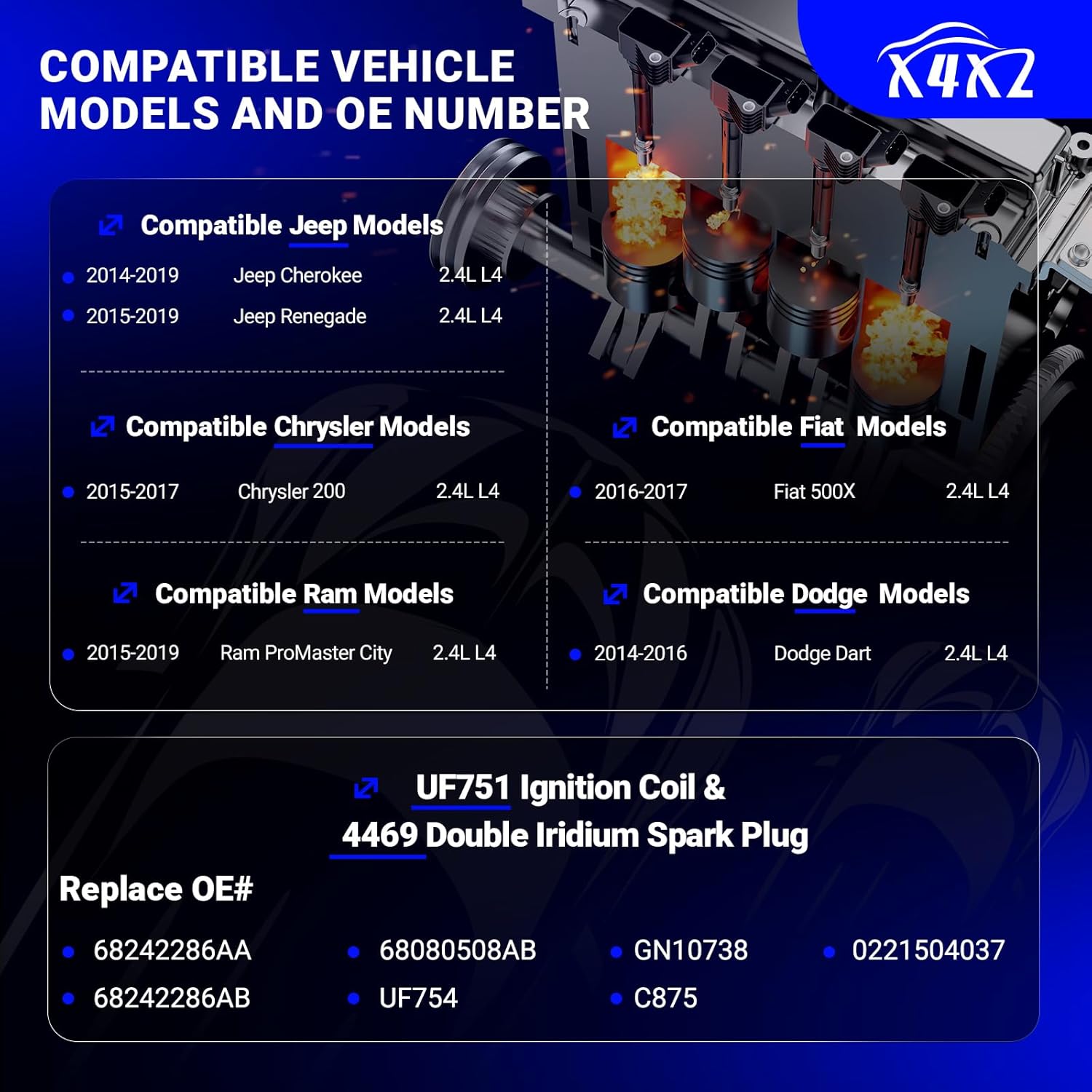 UF751 Ignition Coil & 4469 Double Iridium Spark Plug For 2014-2019 Chrysler 200/Dodge Dart/Jeep Cherokee Renegade/Ram ProMaster City/Fiat 500X 2.4L L4 Replaces# 68242286AA, 68080508AB,UF754, GN10738