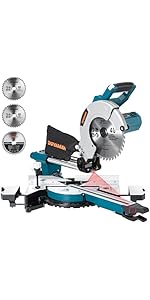 Updated 10-Inch Sliding Miter Saw, Multi-Material Cutting w/ 3 x TCT Blades, Ambidextrous Operation, 5000/3200RPM Speed, Laser Guide, 0-45° Bevel Cut, Max Cut 3.5x13.4in, 9 Positive Stops