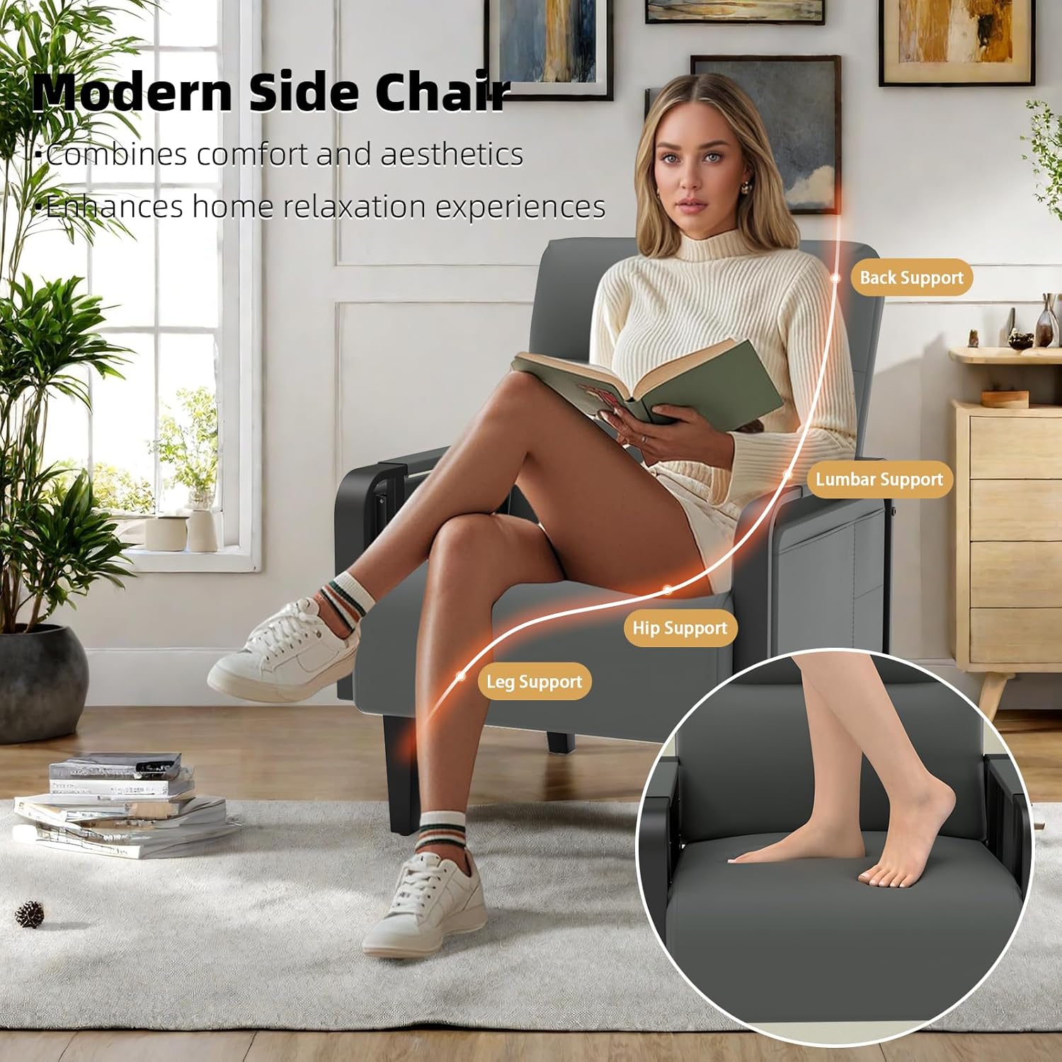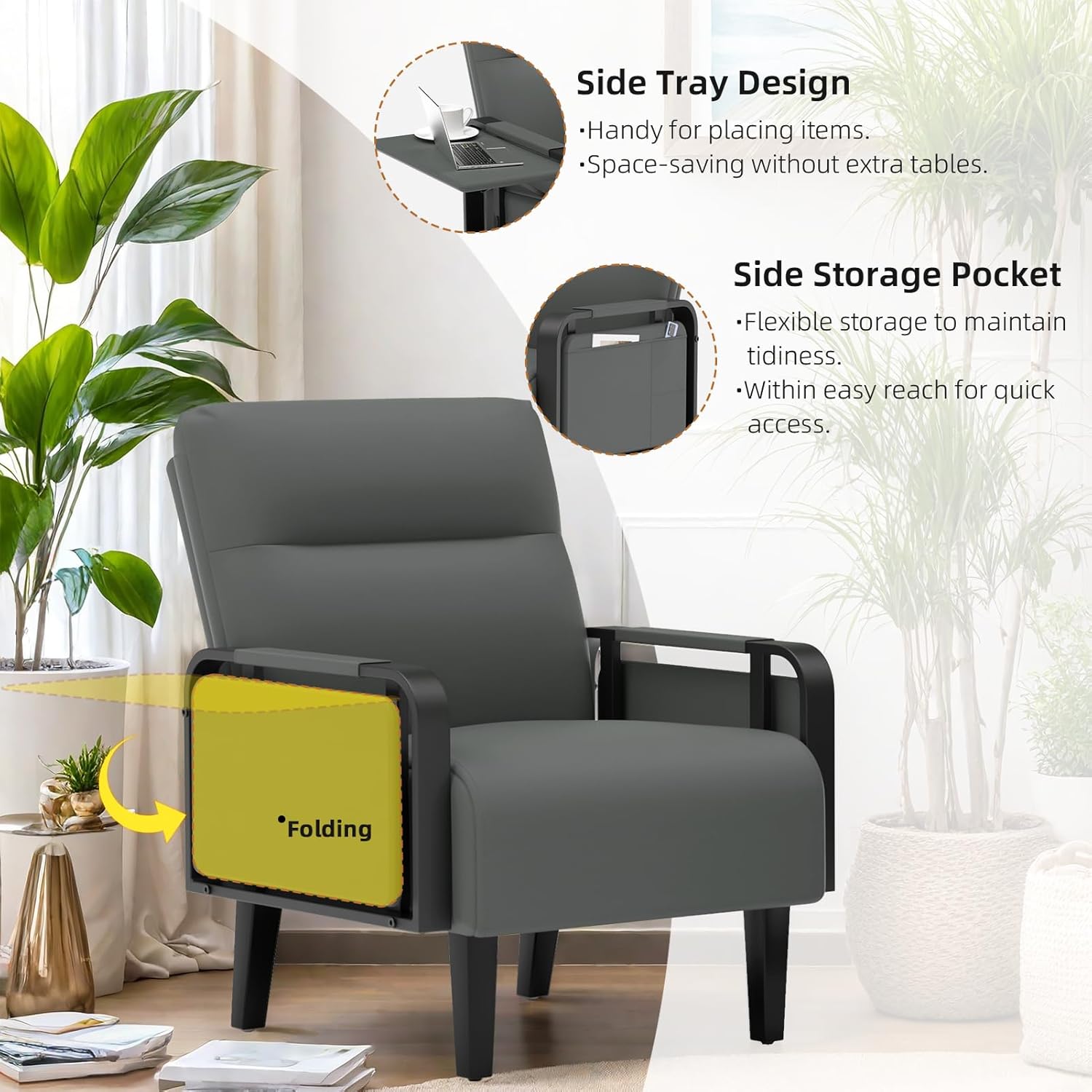 Upholstered Accent Chairs Set of 2, Faux Leather Armchair with Tray Table, Comfy Reading Chair for Living Room, Bedroom, Guest Room, Gray