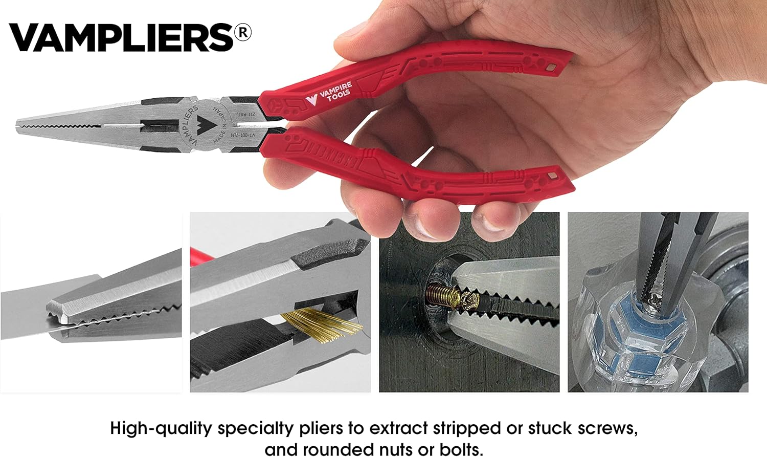 VAMPLIERS 4-PC Screw Extractor Pliers Set Made in Japan: 8" Linesman, 7.5" Long Nose, 6.25" Combination, 5" ESD Safe Mini Plier + Tool Pouch. Remove any Stripped/Damaged/Rusted Screws.