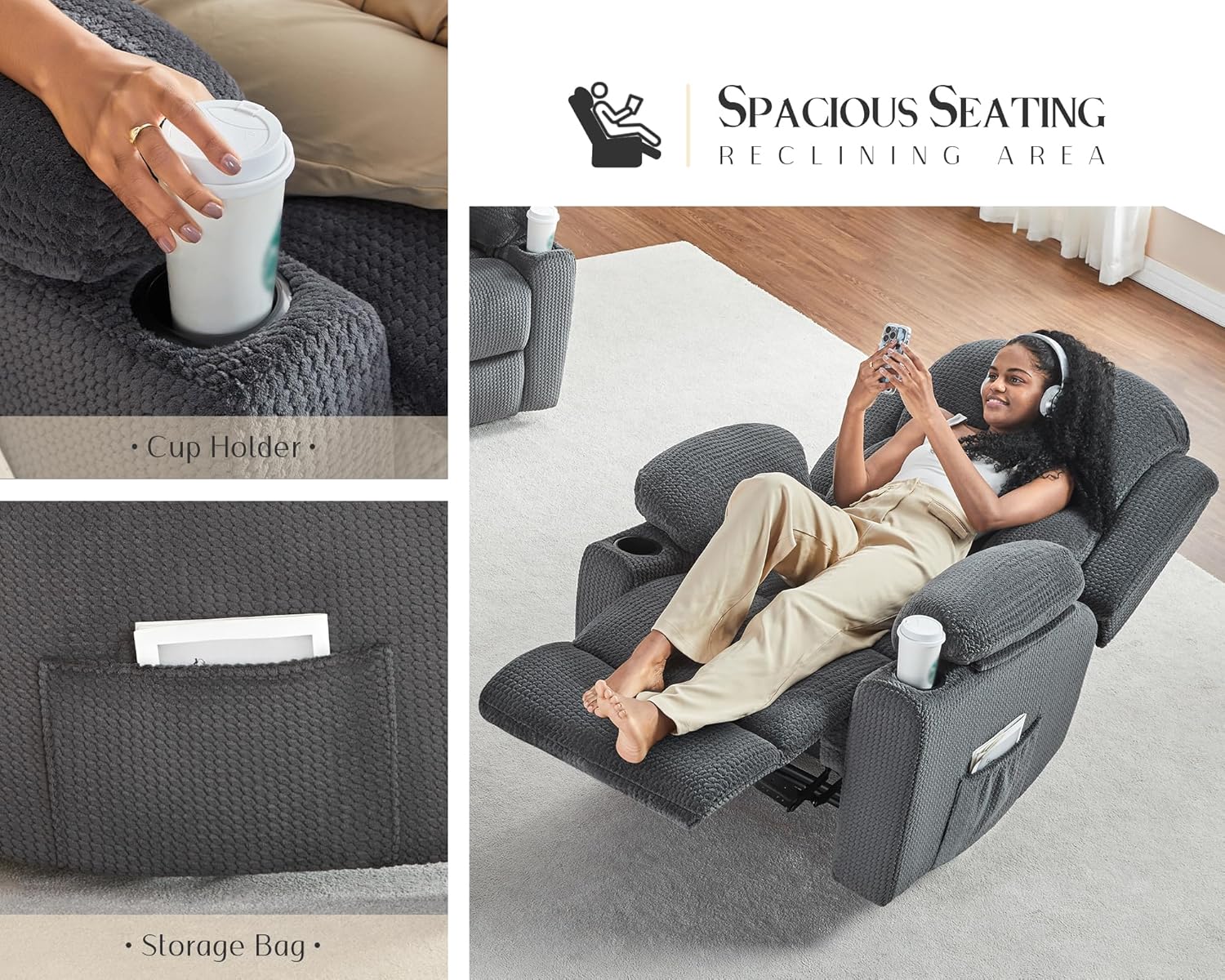 VanAcc Recliner Chair, Sofa Recliner with Cup Holders for Living Room- Wingback Recliner Couch, Grey Armchair