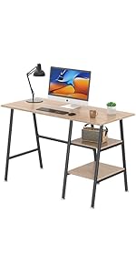 Flexible desk, the computer desk has two storage shelves that can be fixed on the left or right side of the desk according to your preference; the small wooden board on the top can be adjusted and mounted in the holes above to make room for a large computer tower; the two wooden boards are fixed to the metal bars to ensure load-bearing capacity.