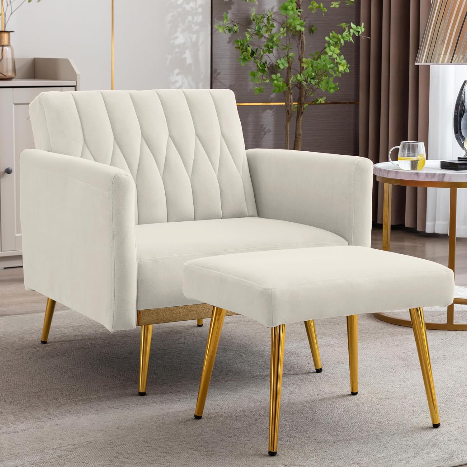 Velvet Accent Chair with Ottoman Modern Upholstered Tufted Armchair, Comfy Single Sofa Chair with Golden Metal Legs and Adjustable Arms for Living Room Bedroom Reading Room Office Pink