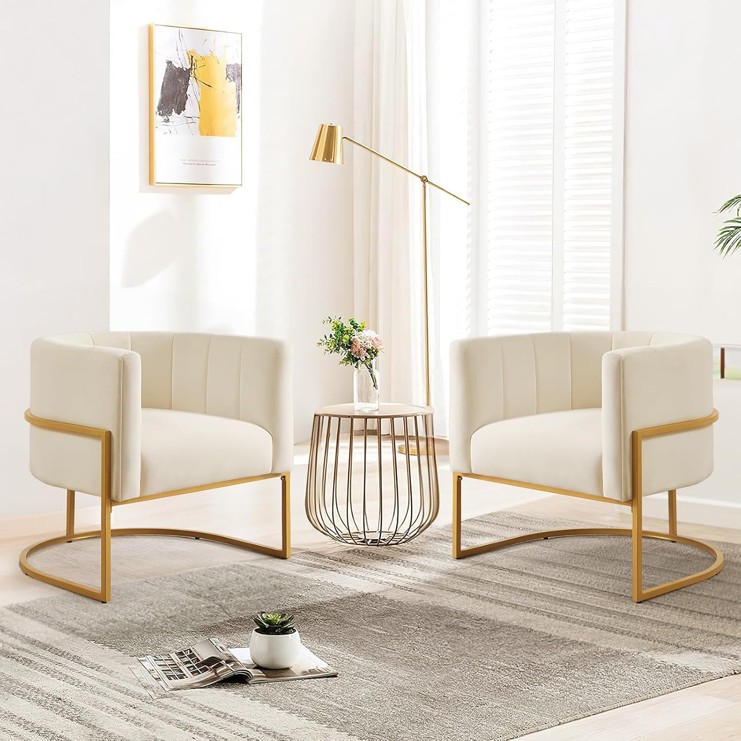 【Contemporary and Stylish】Deolme arm chair has a traditional barrel shape with a rounded back and arms, set on top of an open, curved metal frame with a sleek gold finish. The soft velvet upholstery over generous high-density foam is exceptionally comfortable. We love that the gold accent chair's mid-century modern vibe brings a luxe look to any contemporary space.