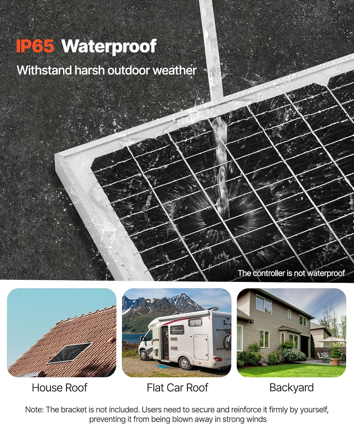VEVOR 50W 12V Solar Battery Charger Maintainer, Mono Solar Panel Trickle Battery Charger with Upgraded MPPT Controller, IP65 Waterproof for Car Boat RV Trailer Flat Rooftop (Bracket Not Included)