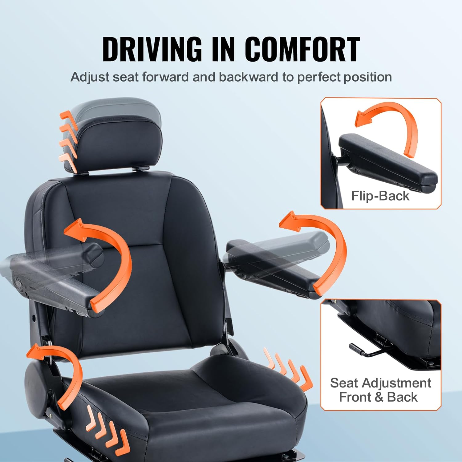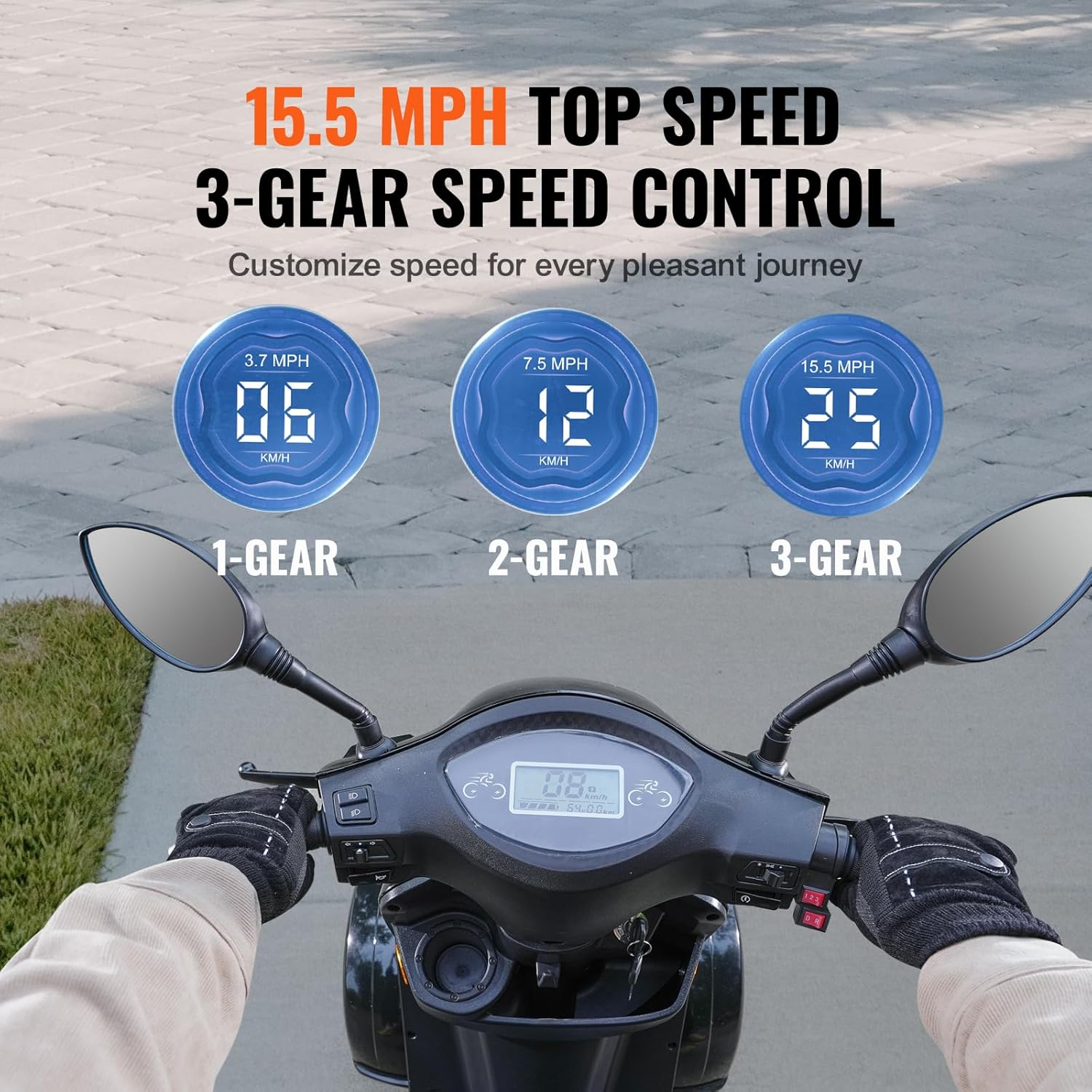 Upgrade Your Daily Travel Experience! VEVOR heavy duty 4-wheel mobility scooter offers you a stable and comfortable ride with an impressive 31-mile range on a single charge. Choose from 3-speed settings to tailor your journey, whether it's a leisurely stroll, daily commuting, or fast-paced travel.