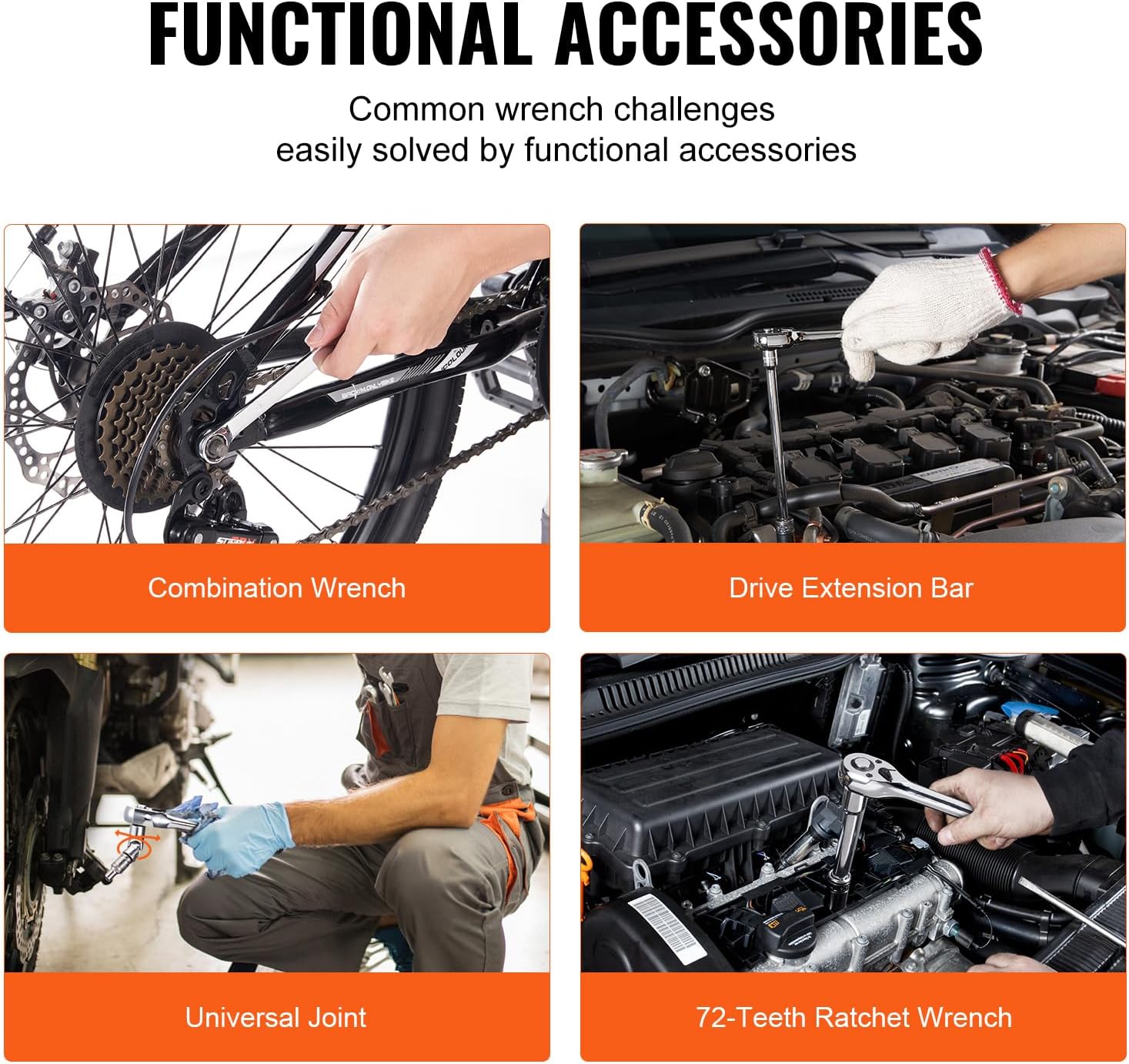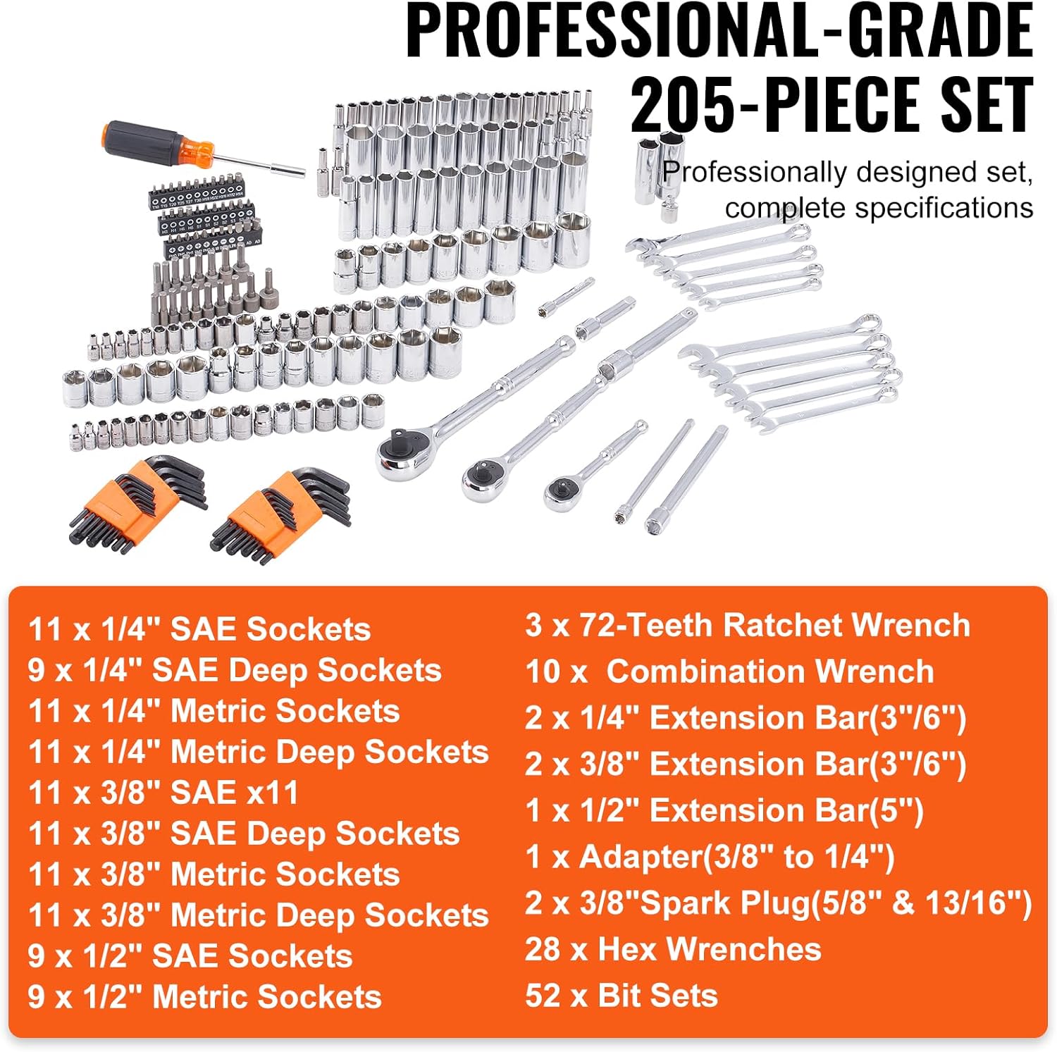 VEVOR Mechanics Tool Set, 1/4" & 3/8"& 1/2" Drive Deep and Standard Sockets, SAE/Metric 205 Pcs Mechanic Tool Kit with Bits, Combination Wrench, Hex Wrenches, Accessories, Storage Case