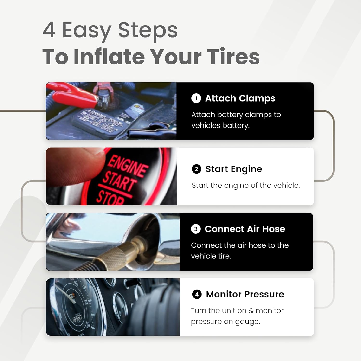 Attach the alligator clips to your vehicle's battery terminals, start your engine, and power on the unit. Connect the air hose to your vehicle's tire. The 88P relies on a simple On/Off switch. Simply monitor the pressure gauge and fill to your desired pressure.