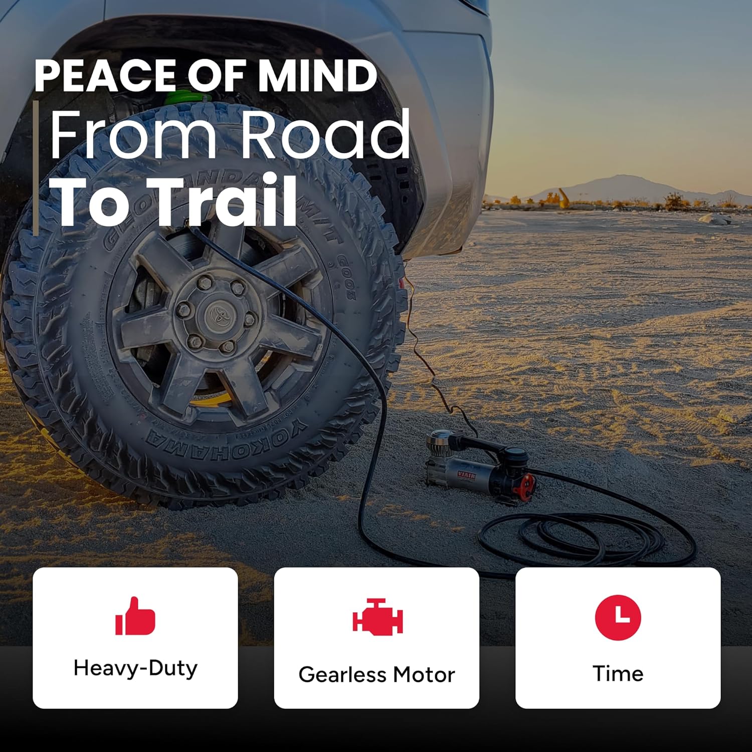 From cars and trucks, to motorcycles and side-by-sides, this small air compressor is portable and powerful. Filling a 225/60/18 tire in 50 seconds or less, the 88P gets you back on the road in minutes, no matter what rig you drive.