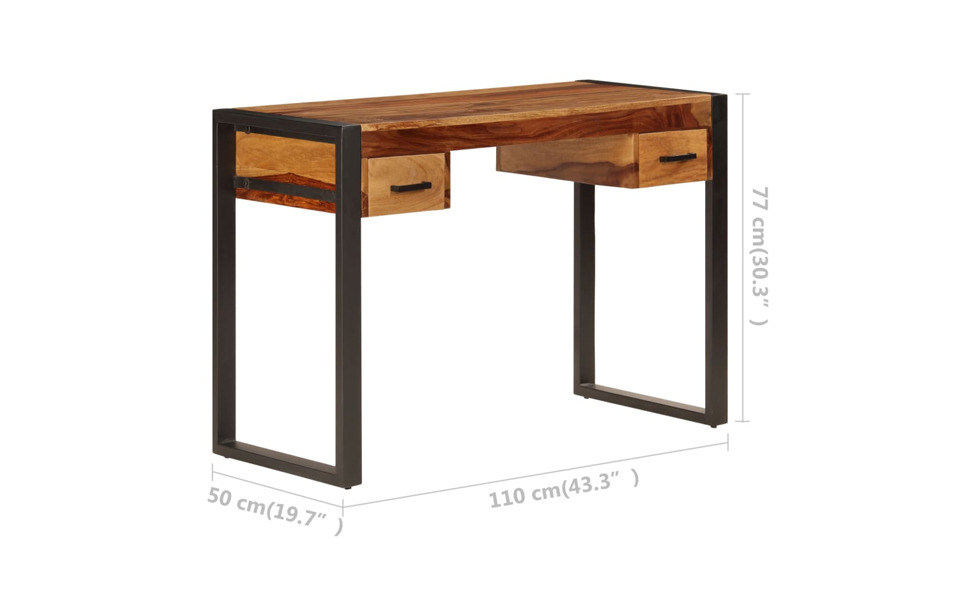 vidaXL Solid Wood Desk - Industrial Style Writing Desk with 2 Drawers, Durable Steel Frame, Multifunctional Home Office Furniture, 43.3"x19.7"x30.3"