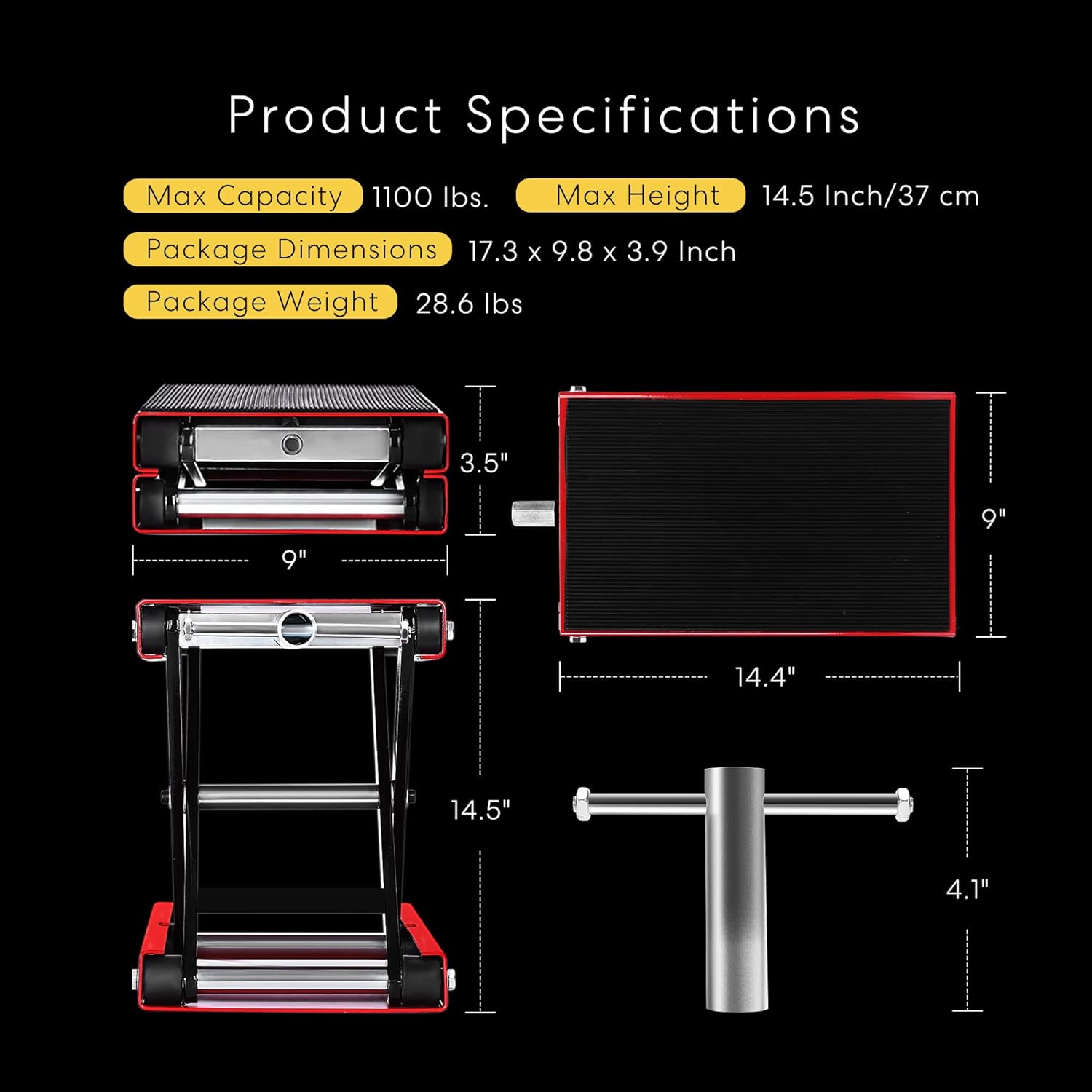 The VIVOHOME motorcycle center scissor lift jack is equipped with safety pins and wing designs on each side. The stand has excellent stability and can prevent accidents with its durable anti-slip rubber pad. Partner up with this jack and let it do the heavy work of hoisting motorcycles!