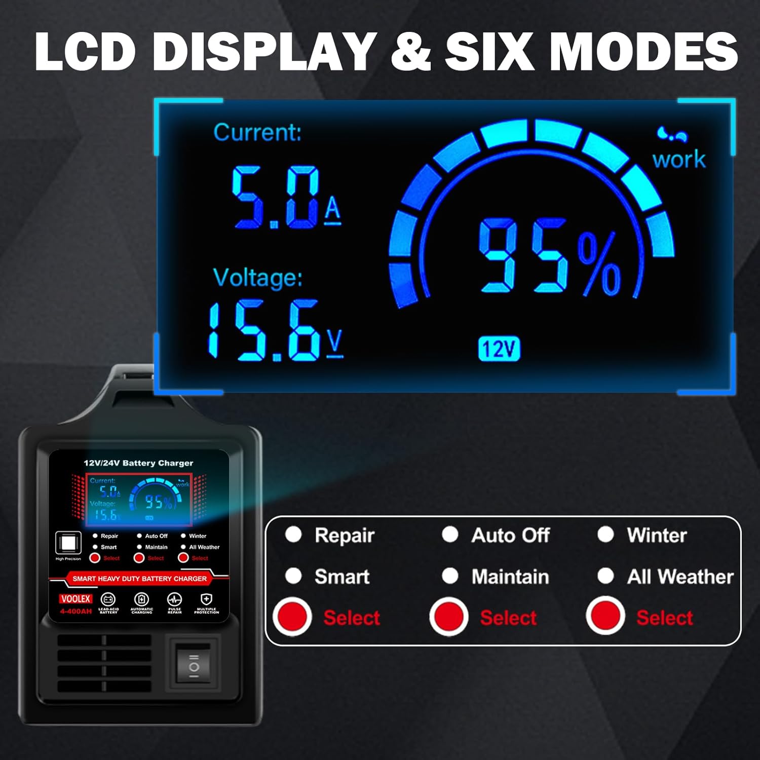 Voolex Car Battery Charger 12V 24V Portable Automotive Trickle Charger Battery Maintainer for AGM Car Truck Motorcycle RV Deep Cycle Repair, Winter Mode(for Lead Acid Batteries)