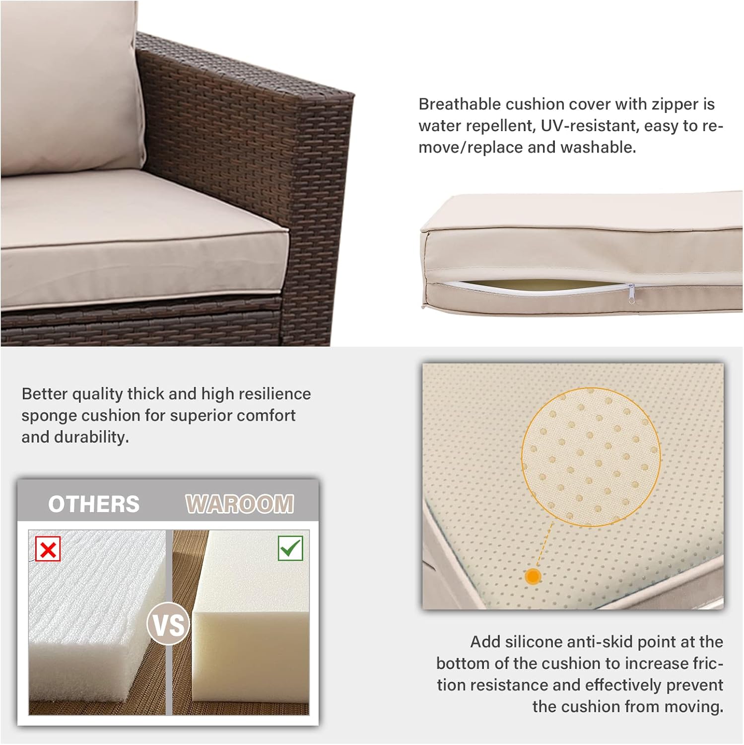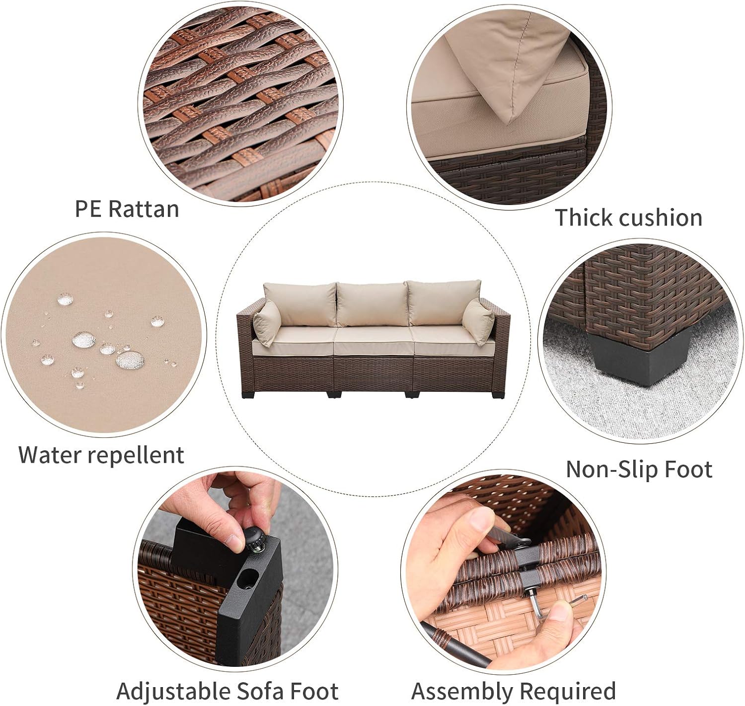 WAROOM Patio Couch PE Wicker 3-Seat Outdoor Brown Rattan Sofa Deep Seating Furniture with Non-Slip Beige Cushion