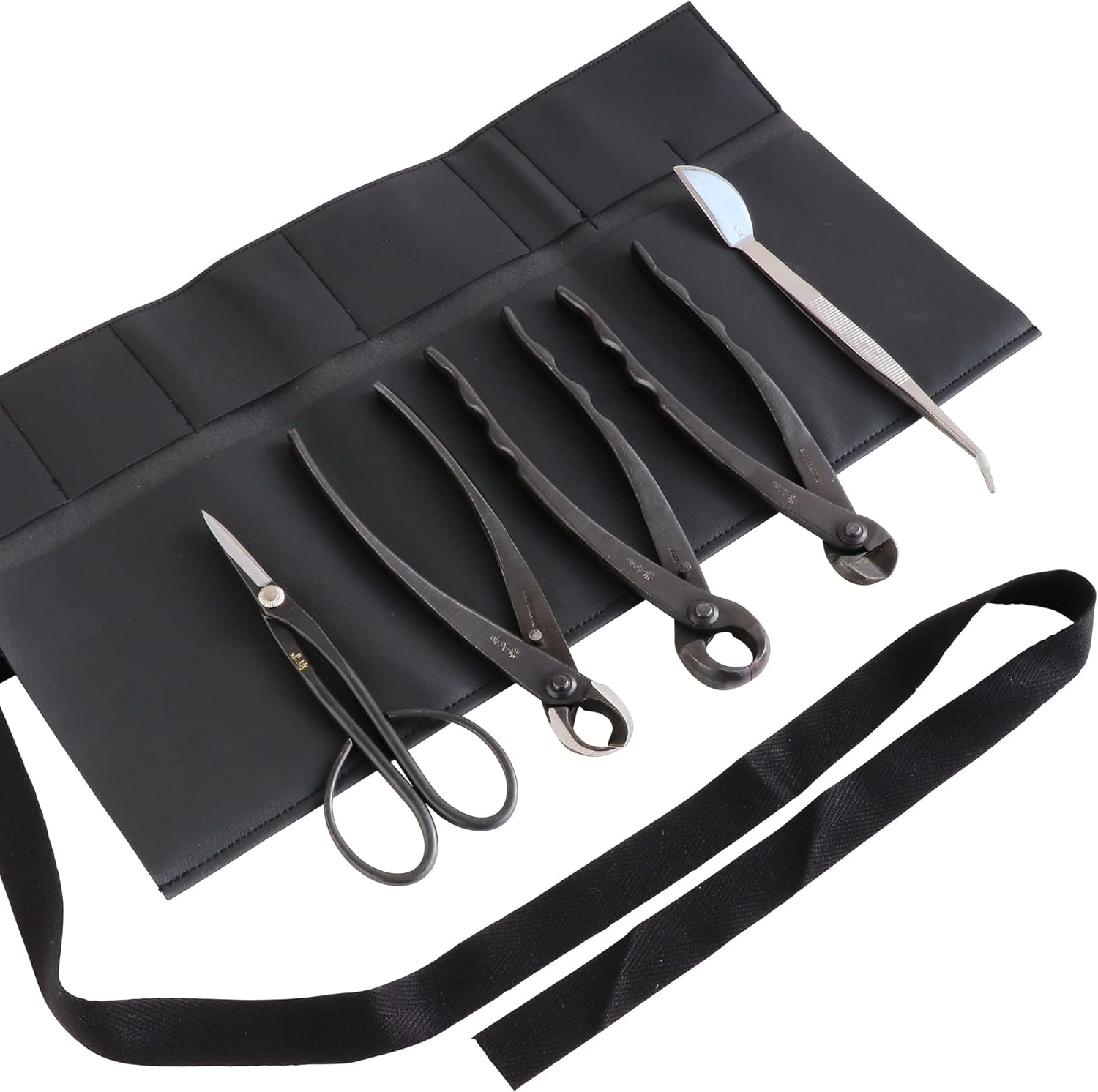 Wazakura Made in Japan 5PCS Bonsai Tool Kit with Roll Bag: Yasugi Steel Satsuki Bonsai Scissors, Concave Branch Cutter, Knob Cutter, Wire Cutter, Tweezers - 5 Tools Satsuki Set with Case