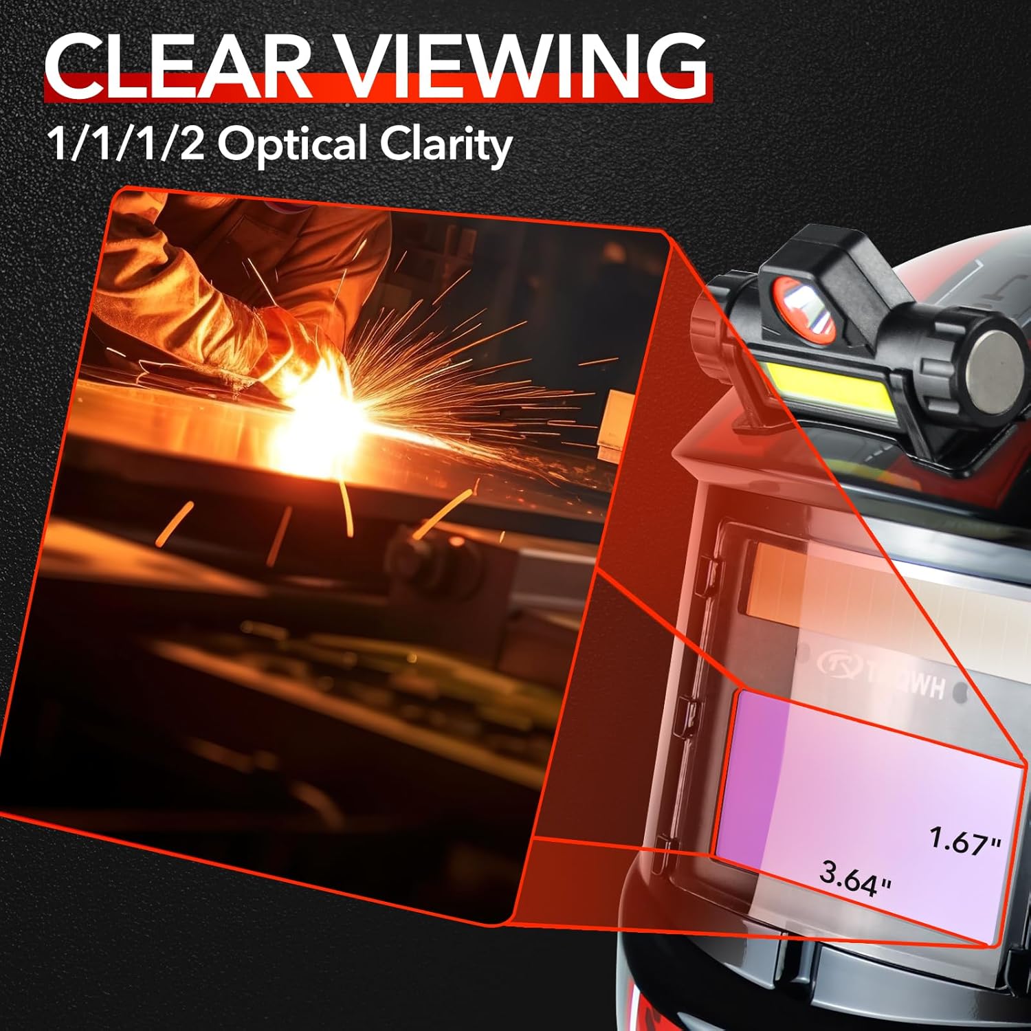 TRQWH auto darkening welding helmet with LED light. The welding hood with newly upgraded true color technology , 1-1-1-2 optical clarity rating restore every details of working conditions, improved visibility and reduced your eye strain. And technical standard of EN379 and ANSI Z87.1.
