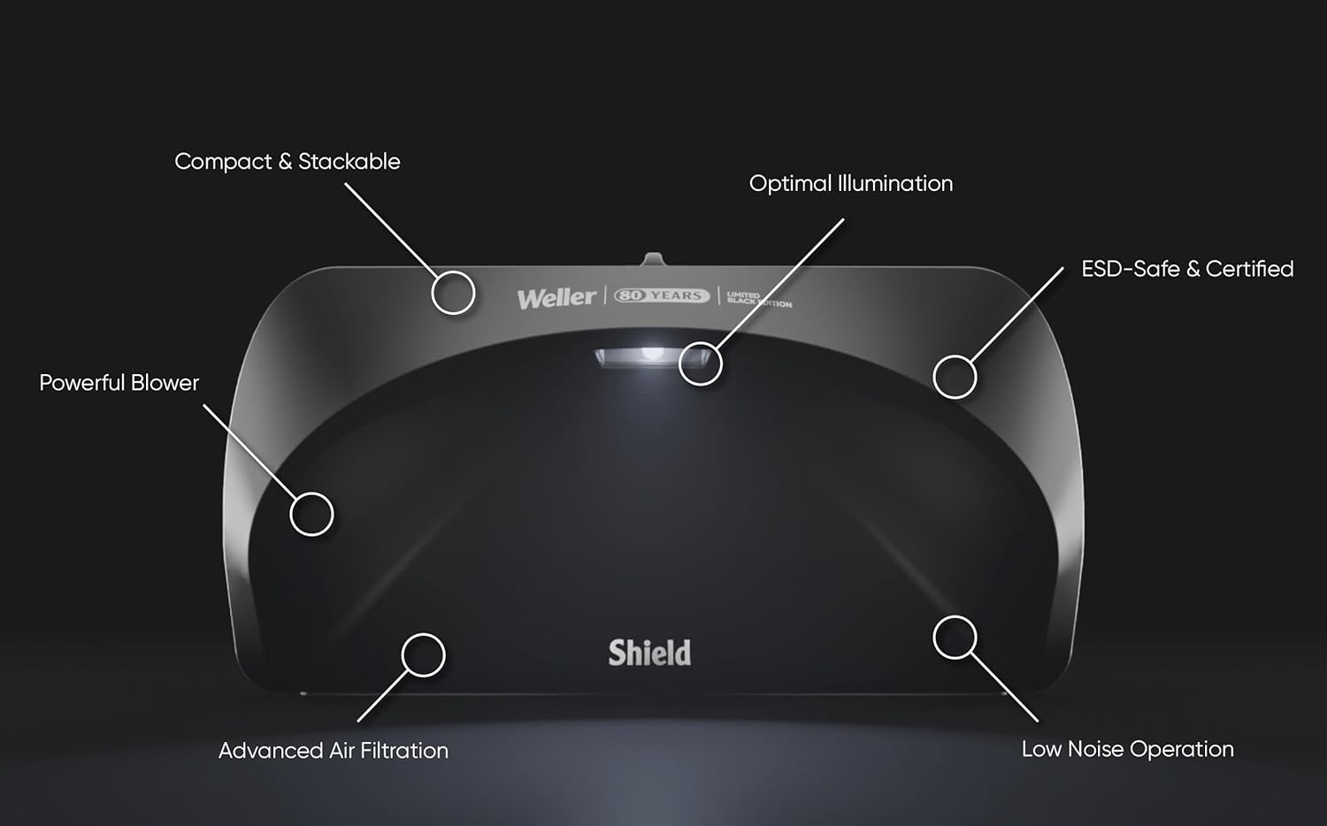 The Weller ZeroSmog Shield is a compact air purification system for the workplace. Designed specifically for soldering in laboratories, workshops and manufacturing environments, it reliably filters smoke, vapours and particles from the air. This helps to create a clean and healthy working environment, which is particularly important during longer soldering jobs. Thanks to its clever design, the ZeroSmog Shield can be stacked directly on top of any soldering station. This saves valuable bench space and ensures the efficient use of the available work area
