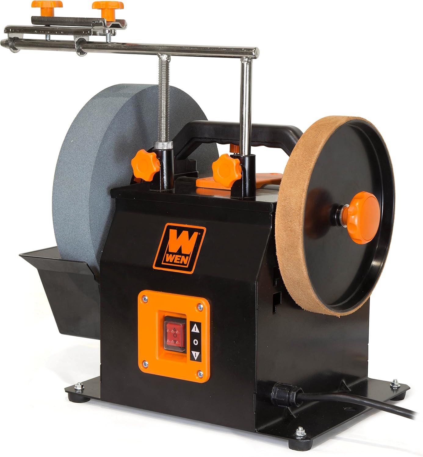 Create the sharpest edges known to man with the WEN 10-Inch Two-Direction Water Cooled Wet and Dry Sharpening System. Boasting a 10-inch by 2-inch 220 grit wet sharpening stone and an 8-inch by 1-1/8-inch leather stropping wheel, you’ll have everything you need to bring dull tools back to life. The heavy-duty 1.6A motor quietly rotates the wheels at an earnest 115 RPM for maximum precision during operation. Once the edge is nice and sharp, polish and finish the surface on the leather stropping wheel with the included honing compound. Resuscitate dull blades, wood chisels, carving tools, scissors, screwdrivers, lathe tools, axes and more. Reverse the rotational direction with the simple flip of a switch to meet the needs of any task. The universal support adjusts to both horizontal and vertical positions, allowing for jigs and other accessories to be utilized with the machine. The WEN 10-inch Wet/Dry Sharpener also includes an angle guide, a height adjustable water reservoir, and a jig for sharpening planer blades and chisels. The WEN 42704B 4-Piece Sharpening Accessory Kit is also available for other blade styles. The carrying handle makes transportation easier than ever while the mounting brackets combined with the sturdy base prevent walking and wobbling during operation. And, because its a WEN product, your 10-Inch Wet and Dry Sharpening System comes backed by a two year warranty, a nationwide network of skilled service technicians and a friendly customer phone line.
