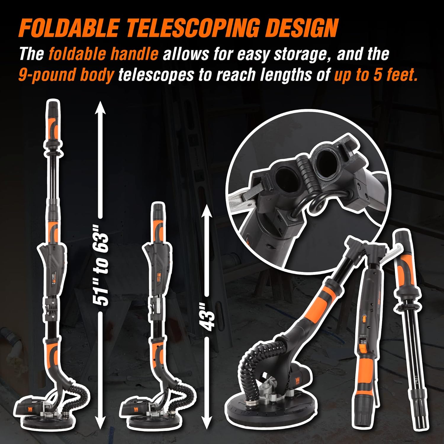 Remember when you could sand those hard to reach places? the WEN variable speed drywall Sander goes where no Sander has gone before. With a pivoting 8.5-Inch head that swivels in all directions, the WEN drywall Sander automatically adjusts to be flush against every surface that crosses its path. Adjust the speed anywhere from 600 to 1500 RPM to meet the needs of the project at hand. The hook and loop base Pad makes Sandpaper changes a breeze while the Foldable design allows for simple storage and transportation. The lightweight 9-pound body telescopes to reach lengths up to five feet away. This package also includes six pieces of hook and loop Sandpaper Disks (60, 80, 120, 150, 180 and 240 Grit) along with a flexible dust vacuum hose that stretches up to 15 feet for reliable dust removal. And because it's a WEN product, your variable speed drywall Sander comes backed by a two-year warranty, a nationwide network of skilled service technicians and a friendly customer helpline. Remember when you could reach the unreachable? remember WEN.