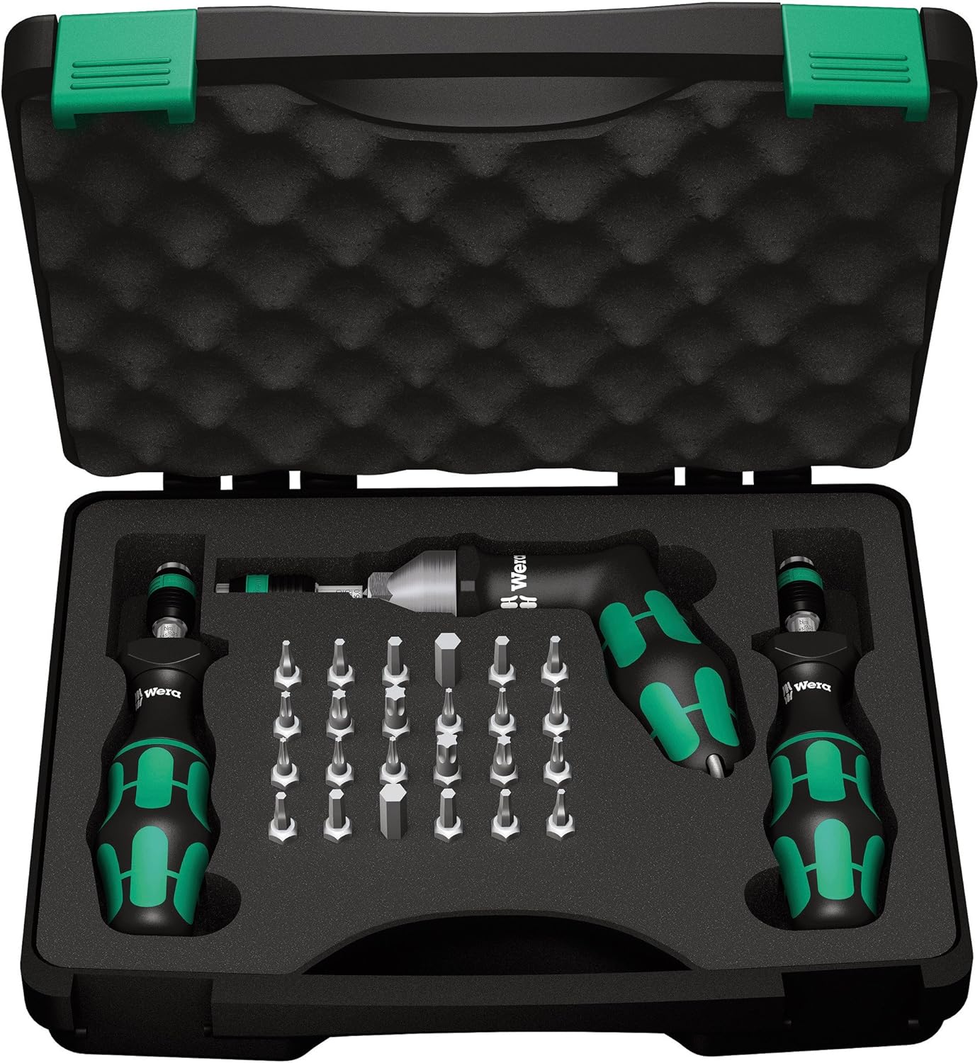 Wera Kraftform 27 Piece Adjustable Torque Screwdriver set is designed for torque controlled tightening to guarantee the safety of the screw connection. Torque can easily be set to the required scale value by hand without special tools. Measurement accuracy is +/- 6% in accordance with standard EN ISO 6789. Wera torque tools have unlimited loosening torque to loosen seized screws. All Wera hand tools feature the trademarked ergonomic Kraftform handle, with hard and soft zones, that fits the shape to the hand for the ultimate in comfort and high-speed torque transfer. Adjustable torque screwdrivers feature the Rapidaptor bitholder with quick-release chuck that allows for speedy one-handed bit insertion and removal for insert and power bits. Calibration certificate included. Limited Life Time Warranty. Set contains 1 x 7400 Adjustable Torque screwdriver with Rapidaptor, range 0.3-1.2 Nm, 1 x 7441 Adjustable Torque Screwdriver with Rapidaptor, range 1.2-3.0 Nm, 1 x 7442 Pistol Handle Adjustable Torque Screwdriver with Rapidaptor, range 3.0-6.0 Nm and 24 carbide insert bits, 6 Hex bits– 2mm, 2.5mm, 3mm, 4mm, 5mm, 6mm; 9 Torsion (TZ) TORX bits – TX6, TX7, TX8, TX9, TX10, TX15, TX20, TX25, TX30; 9 TORX PLUS bits – 6 IP, 7 IP, 8 IP, 9 IP, 10 IP, 15 IP, 20 IP, 25 IP, 30 IP. Includes durable storage case with molded insert. Wera – The Best Tools For The Job