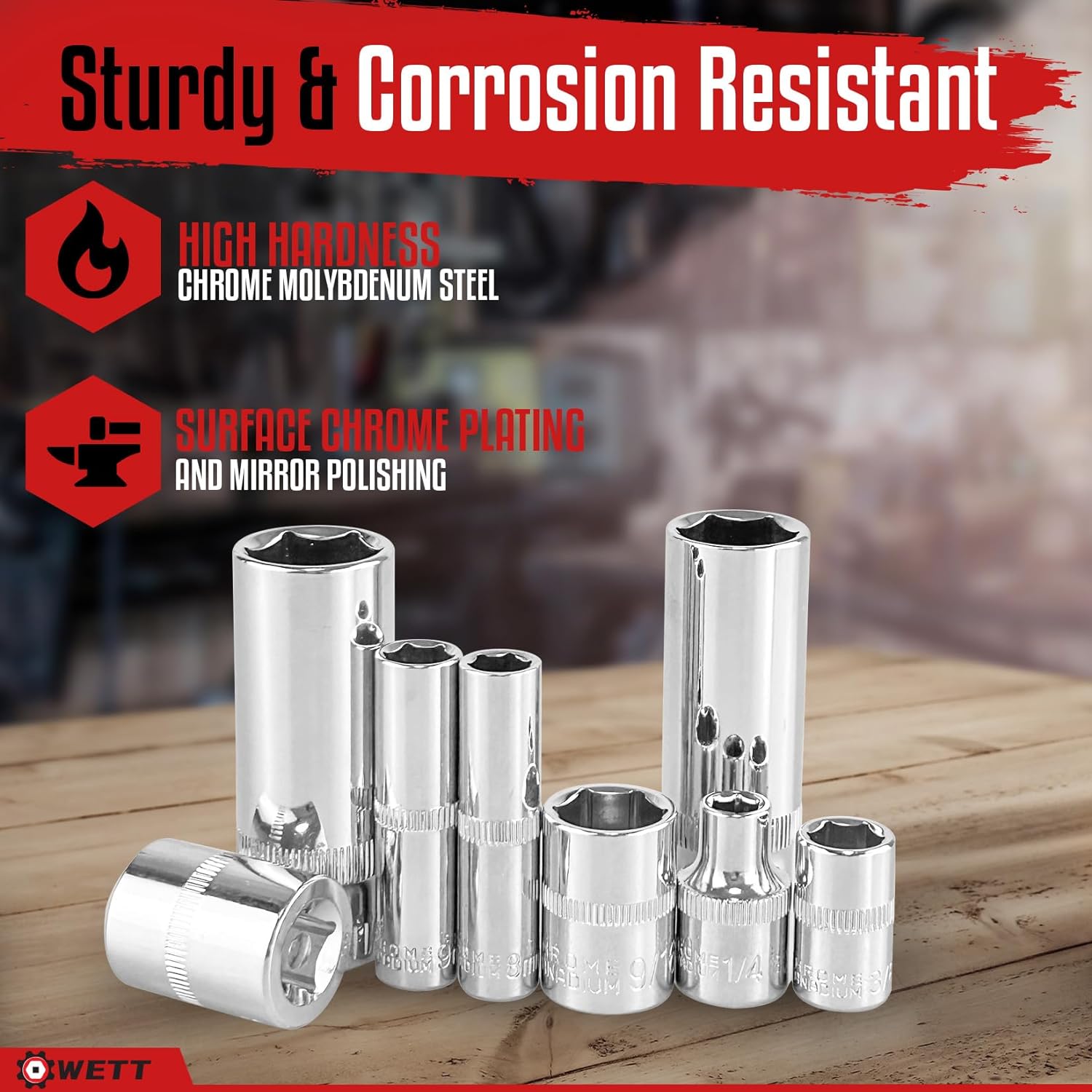 - 3/8" Deep Sockets (SAE/Metric) : 9/16", 5/8", 11/16", 3/4"; 14, 15, 16, 17mm.