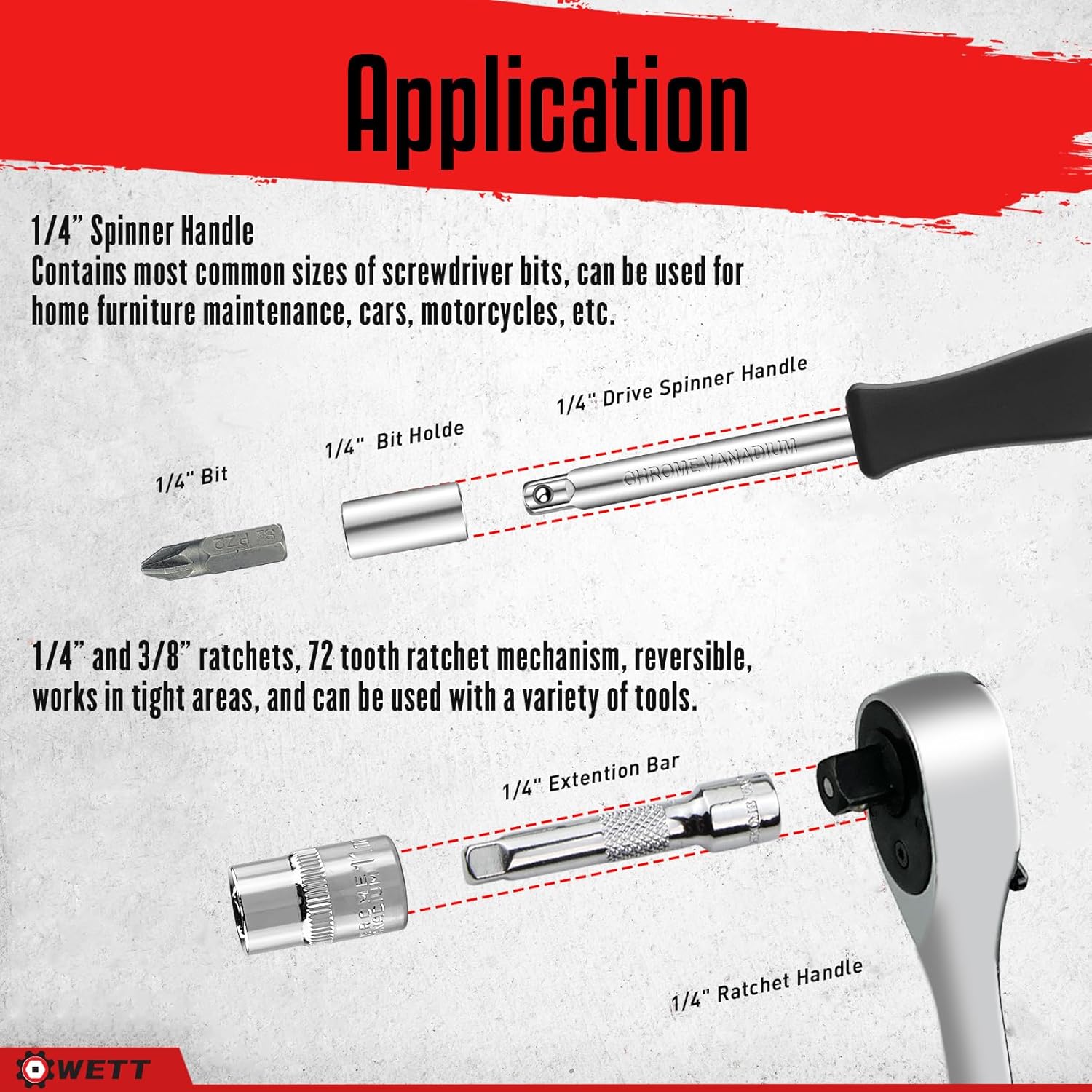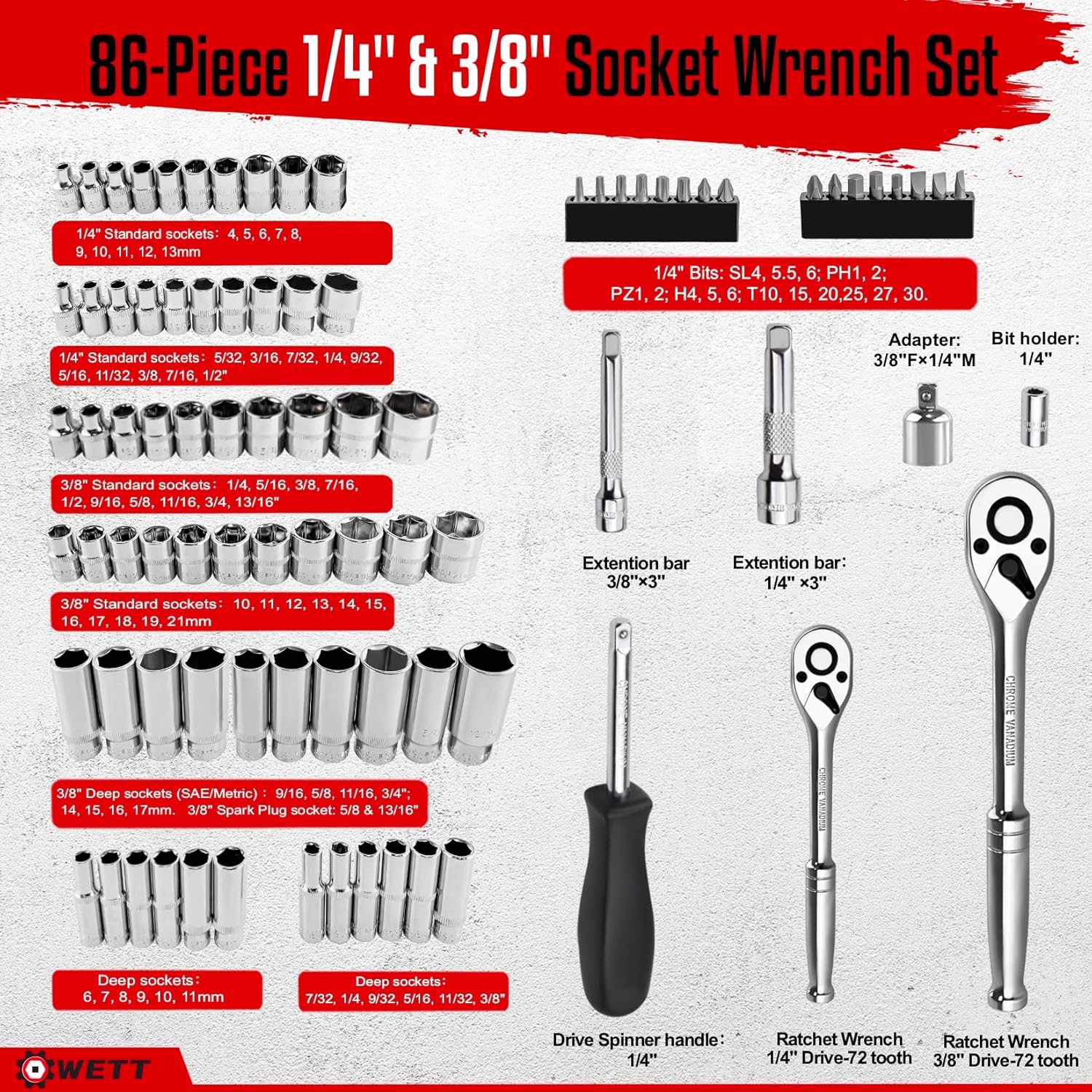 WETT 1/4" and 3/8" Drive Socket Set, 86-Piece Socket Wrench Set with Quick-Release Ratchet, Extention Bar, Adapter, 1/4" Bits, CR-V Steel, Metric/SAE, Deep/Shallow, Mirror Chrome Finish