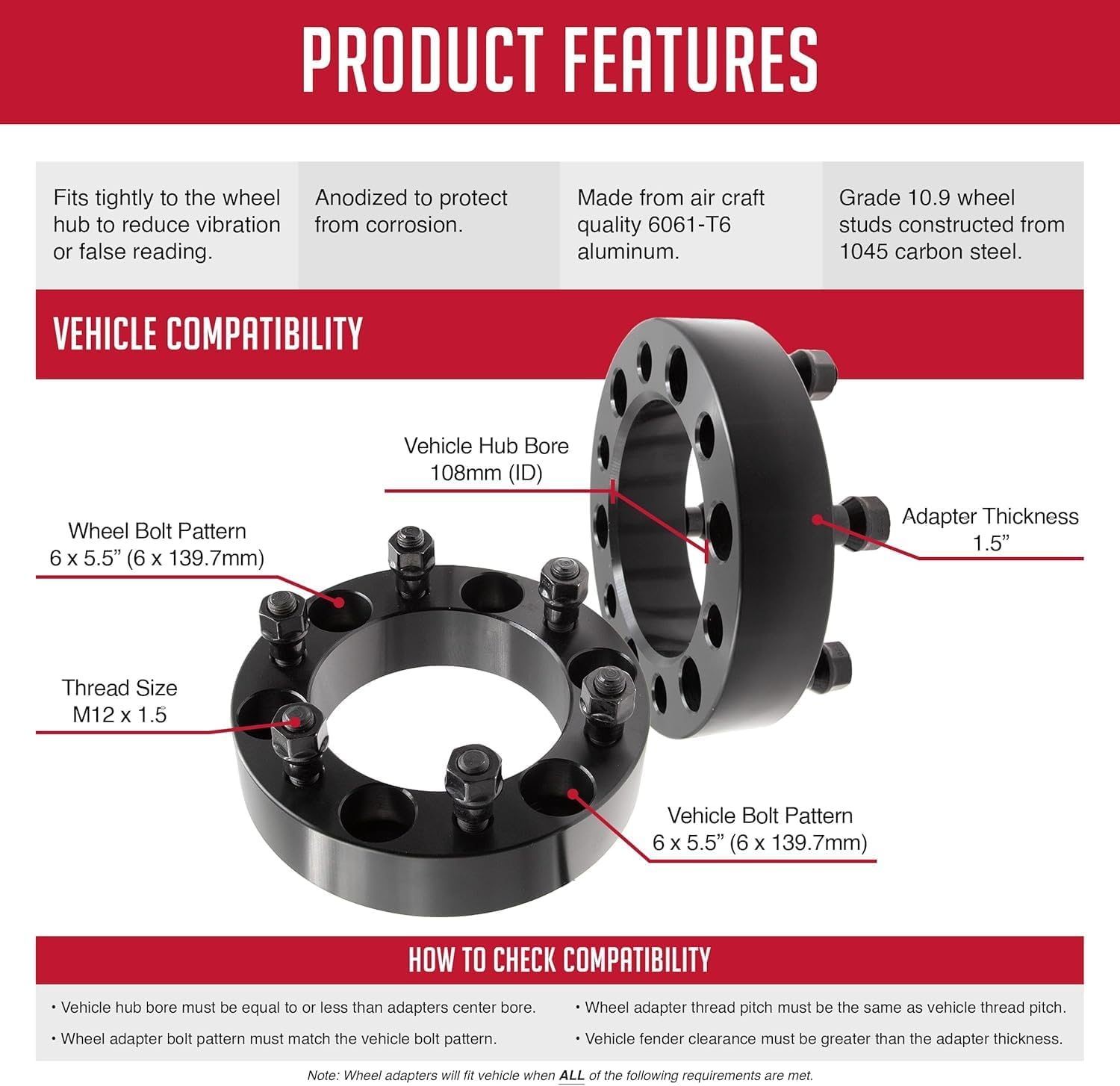 Wheel Accessories Parts 4 Pcs Wheel Spacers Adapters 6x5.5 6x139.7mm 1.50 Inch Thick 108mm Hub M12 1.5 12x1.5 Thread Stud Fits 2004-12 Chevy/GMC Colorado Canyon 1995-2023 Toyota Tacoma 2000-06 Tundra