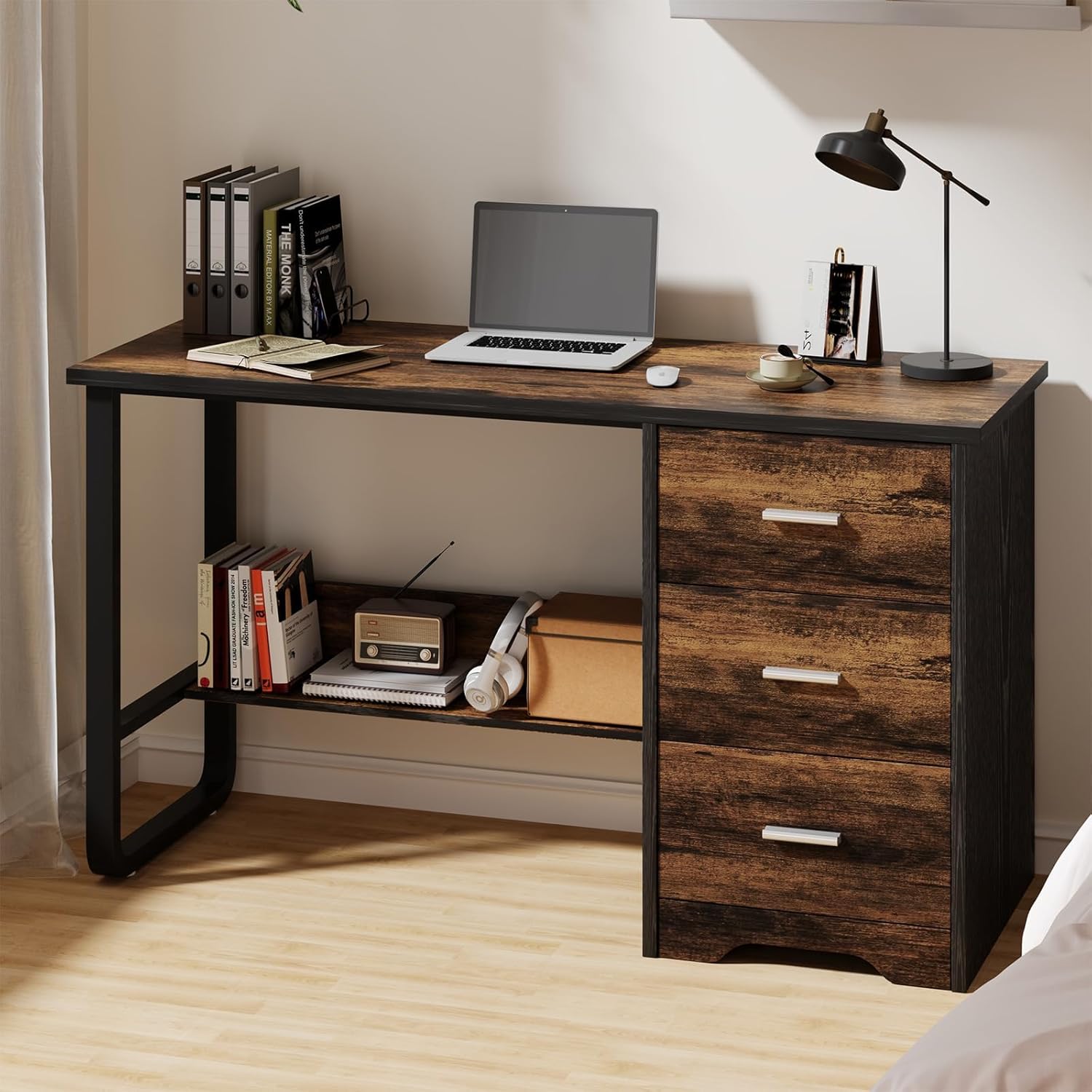 White Desk with 3 Drawers, 47 Inch Computer Desk with Drawers for Bedroom, Small Home Office Desk with File Cabinet, Bottom Shelves for Small Spaces