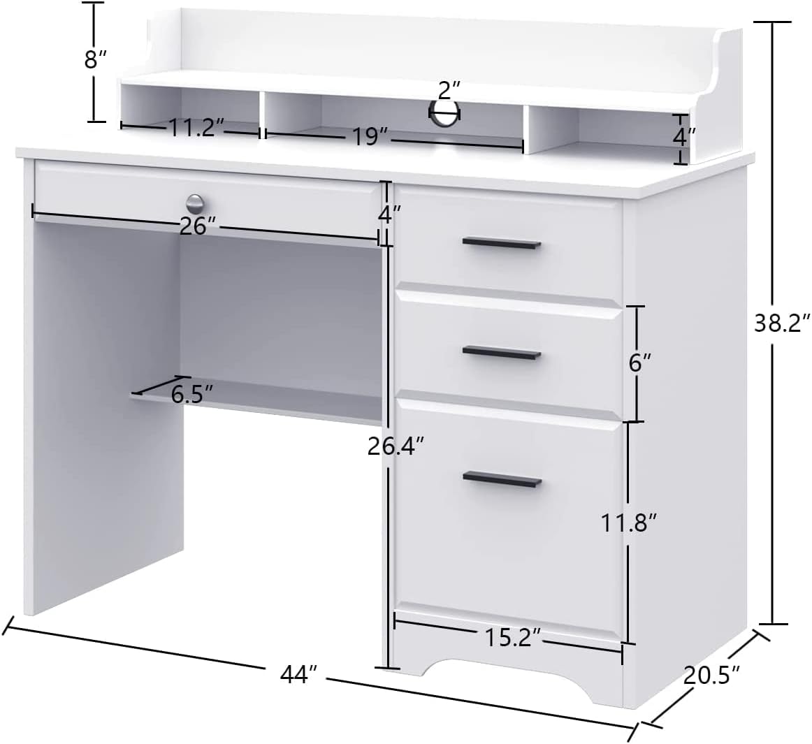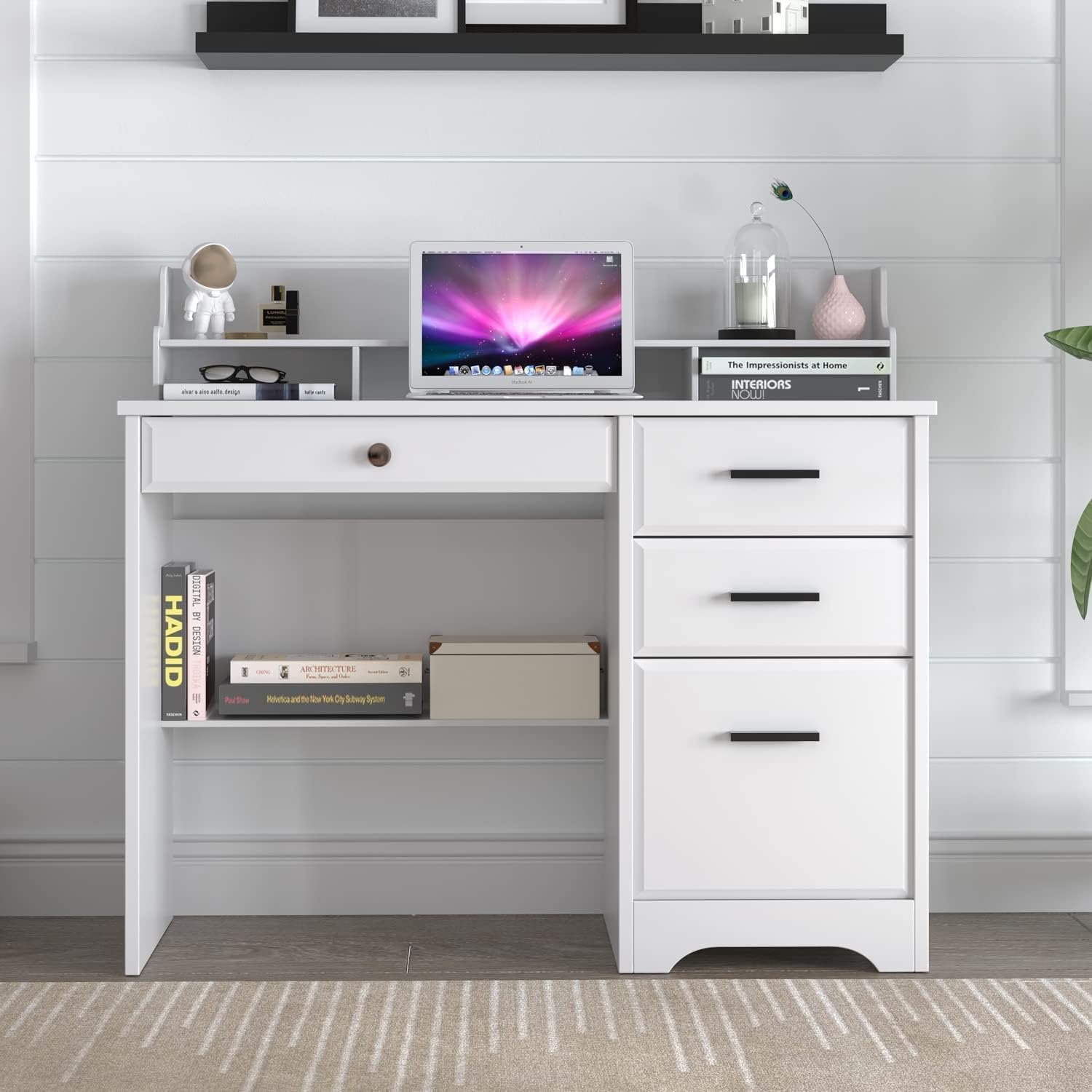 White Desk with Drawers and Storage, Home Office Desk Computer Desk with 4 Drawers & Hutch, Home Desk Small White Desk with Drawers for Bedroom, Home Office, White