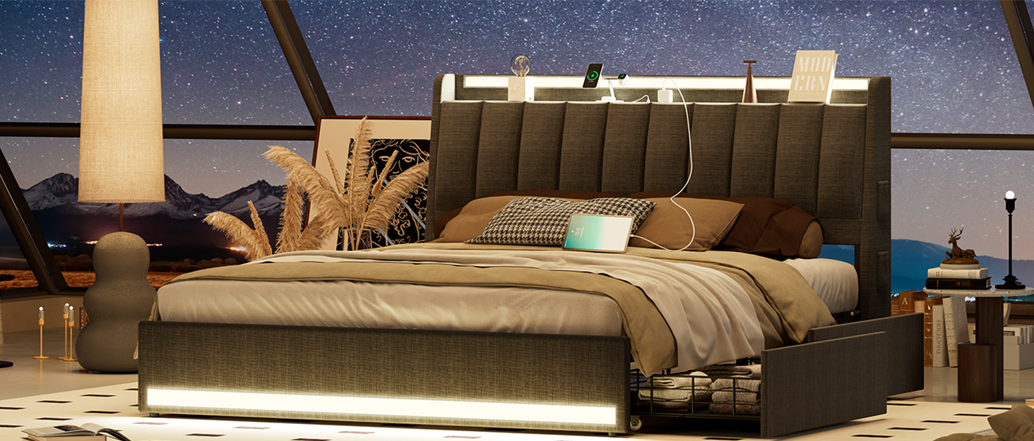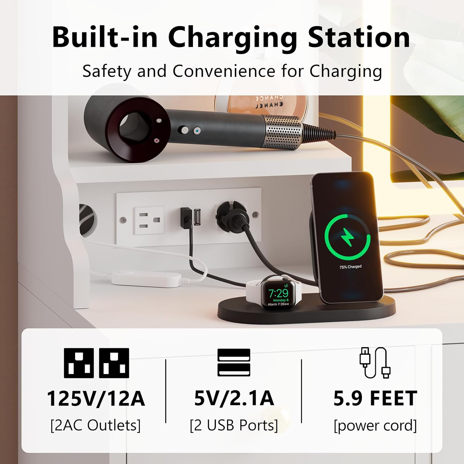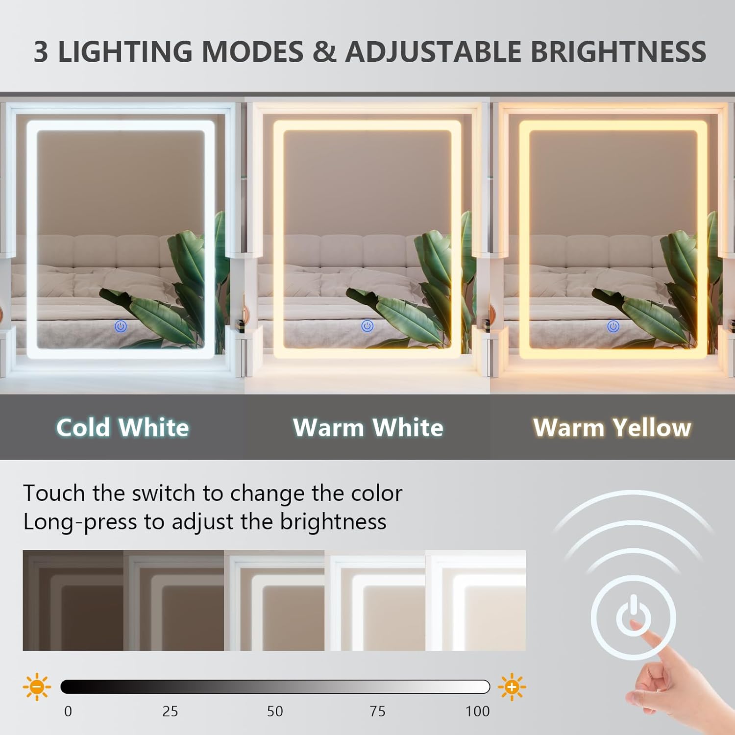 White Makeup Vanity Desk with Mirror and Lights, Large Vanity Table Set with Charging Station, Dressing Table with RGB Cabinets, Makeup Vanity Mirror with Light Desk and Drawers, 3 LED Light Modes