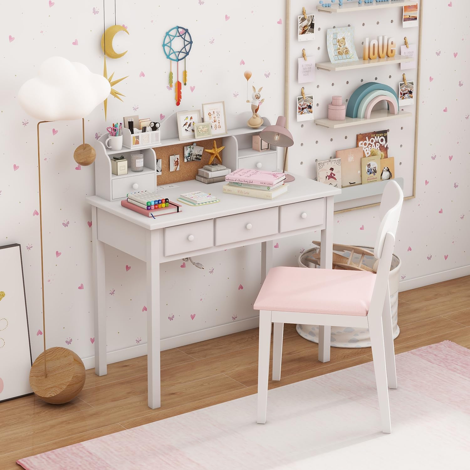 White Writing Desk with Hutch and Drawers, 36 Inch Home Office Desk with Charge Station, Computer Work Station with Storage Shelf