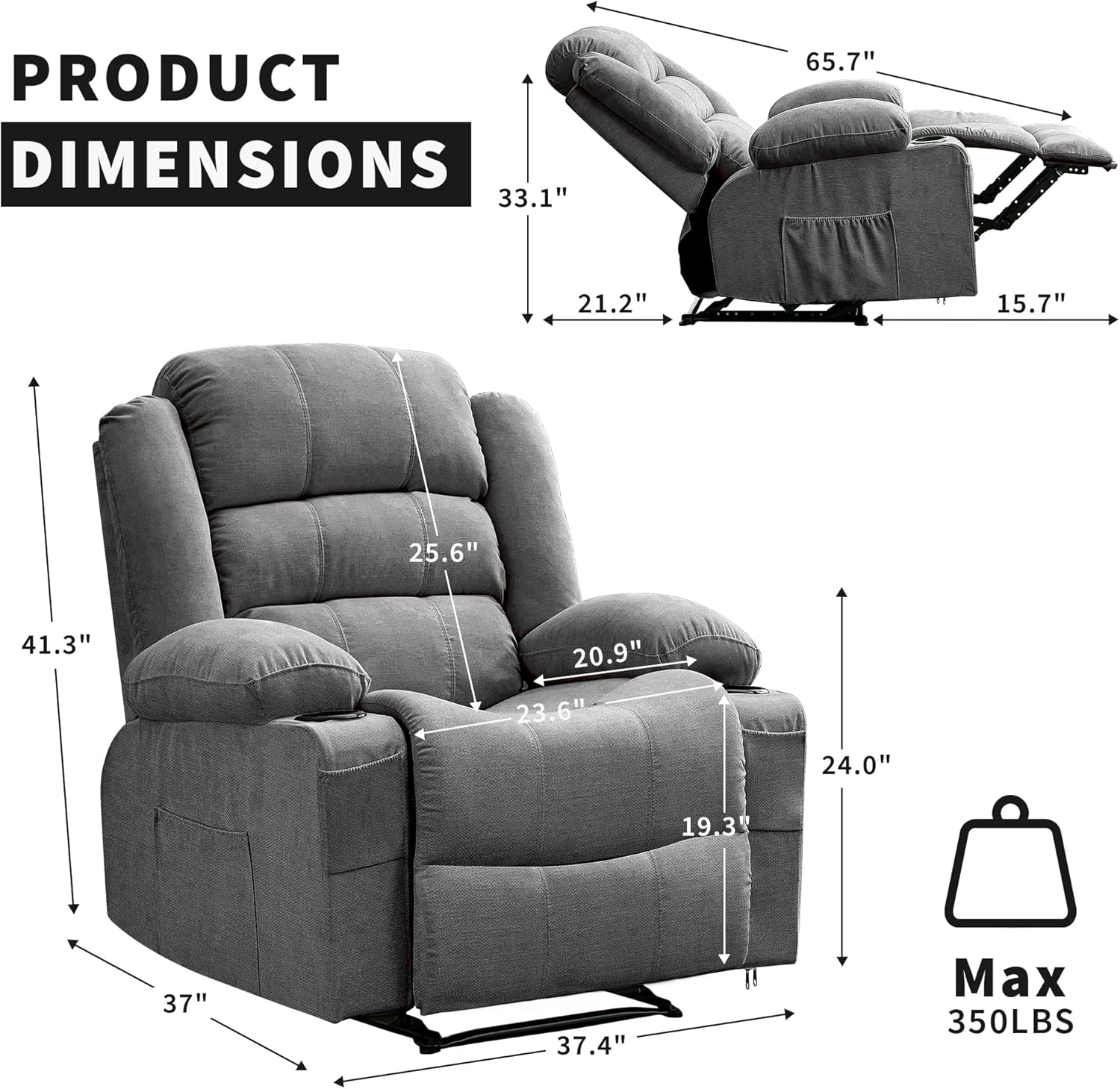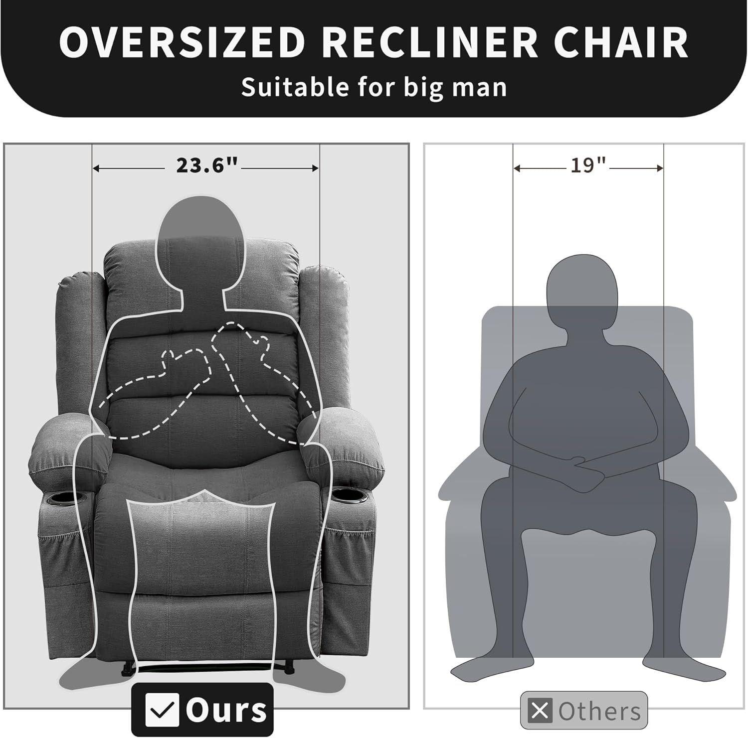 Wide Manual Recliner Chair for Adults – Widen Oversize Overstuffed Breathable Fabric Lounge Chair with 3 Angle Modes 2 Cup Holders Side Pockets