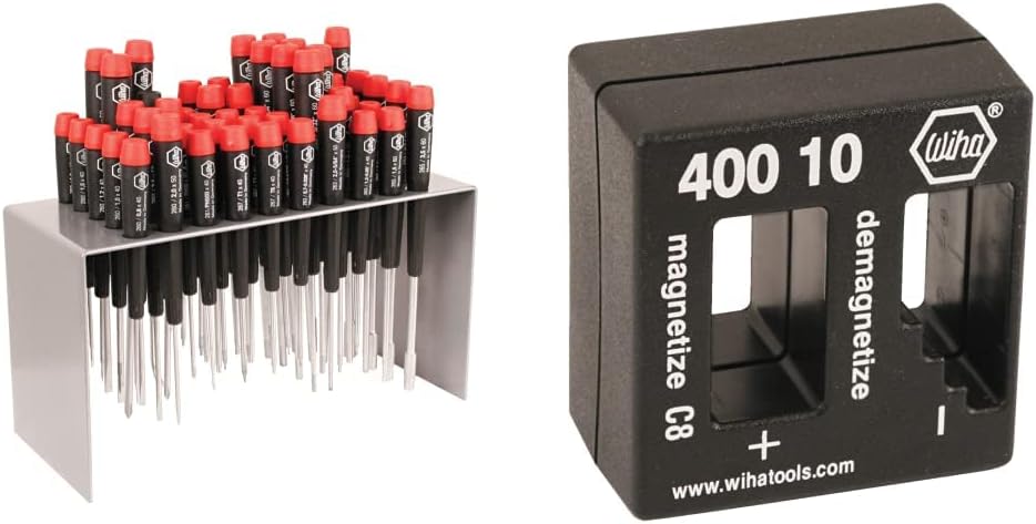 Wiha 92190 Master Technicians Bench Top Set comes with slotted .08mm 1.0mm 1.2mm 1.5mm 1.8mm 2.0mm 2.5mm 3.0mm 3.5mm 4.0mm and Phillips #000, #00, #0, #1. Hex:7mm/.028", .9mm/.035", 1.3mm/.050", 1.5mm, 2.0mm, 2.5mm, 3.0mm, 1/16, 5/64, 3/32, 7/64, 1/8, 9/64, 5/32. Torx T1, T2, T3, T4, T5, T6, T7, T8, T9, T10. Nut Drivers 1.5mm, 1.8mm, 2.0mm, 2.5mm, 3.0mm, 3.5mm, 4.0mm, 4.5mm, 5.0mm, 5.5mm chip lifter in rack.