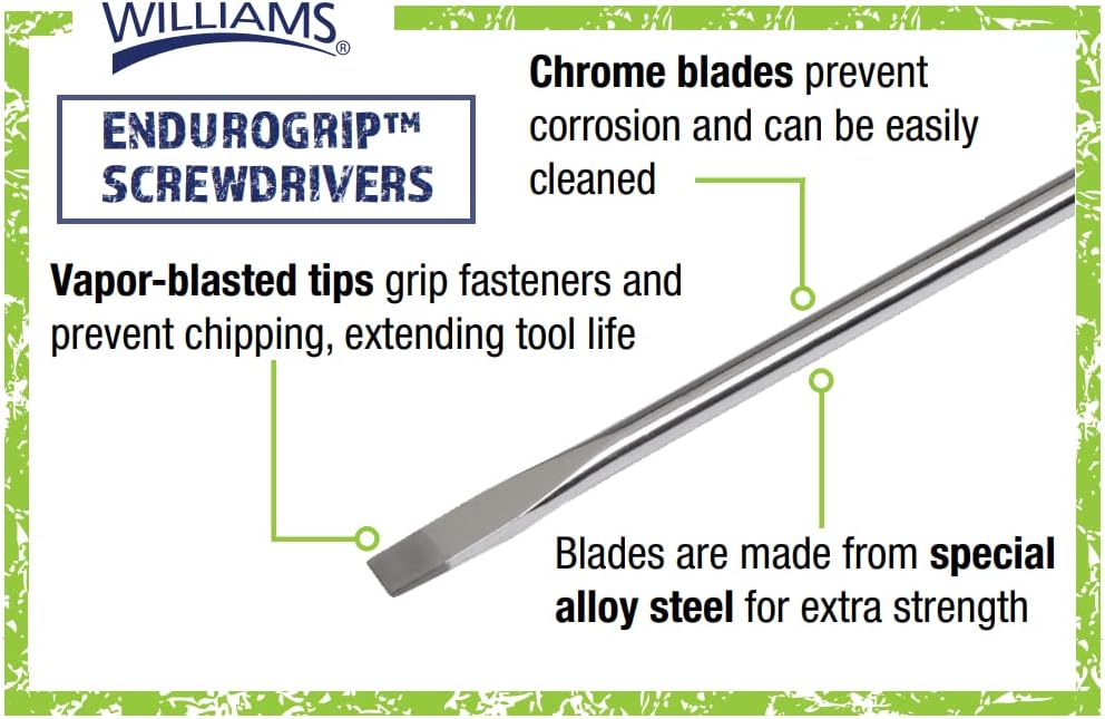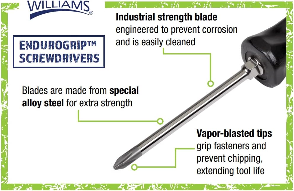 The Williams 19-Piece Endurogrip and Supertorque Combination Screwdriver set includes 5 Cabinet Slotted screwdrivers (Tips Included: 3/16”, 1/8”, 5/32”), 6 Keystone Slotted screwdrivers (Tips Included: 3/16”, ¼” Stubby, ¼”, 5/16”, 3/8”) and 8 Phillips screwdrivers (Tips Included: #0, #1, #2, #3, #4, and #2 Stubby). The Williams ENDUROGRIP Cabinet Slotted Screwdrivers features a comfort grip handle with thumb stop allow for added turning power without discomfort or slippage. The handle also has a flat face which prevents the tool from rolling. The tool features a Hex bolster on the shaft which allows for a wrench to be used for extra turning power and prevents the blade from being forced into the handle. The screwdriver blade is made from special alloy steel that provides extra strength. The high polished chrome blade prevents corrosion and can be easily cleaned after usage. The tip is vapor blasted and grips fasteners and prevents chipping, extending tool life. Every Williams ENDUROGRIP Screwdriver is manufactured in the USA in a Williams facility. Williams ENDUROGRIP Screwdrivers come in 3 different tip styles: Cabinet Slotted, Keystone Slotted, and Phillips. For over 140 years, Williams has manufactured high quality industrial tools for professionals like you. Every day we purposefully choose our next product innovation by examining and understanding your needs, because we know you value your work and pride yourself in being the best. We develop tools strong enough to endure extreme industrial conditions. Leveraging our heritage of making great tools, with the right materials, and precise engineering specifications. Since 1882, Williams had made products designed to be put to work with confidence.