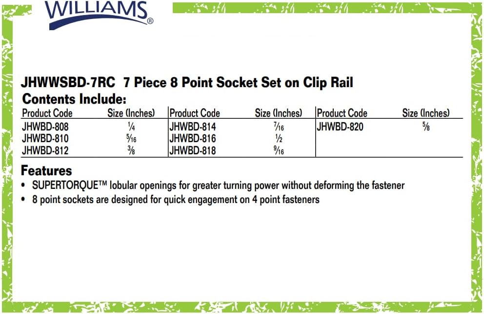Williams JHWWSBD-7RC SuperTorque 7-Piece 3/8-Inch Drive 8 Point Socket Set Lobular Openings Chamfered Ends High Polish Chrome Finish