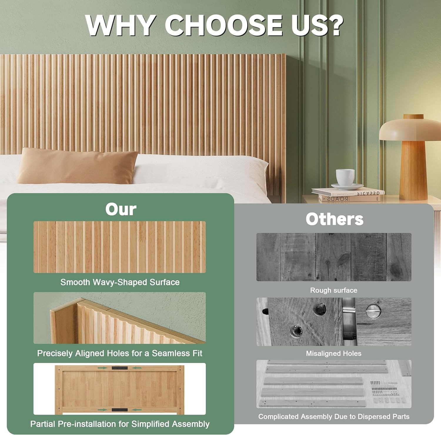 Wood Headboard Queen Size, 64.6" Wide Wooden Queen Headboard Only, Modern Farmhouse Headboards, Wall Mounted Fluted Panel, Wingback Boho Headboards, Natural