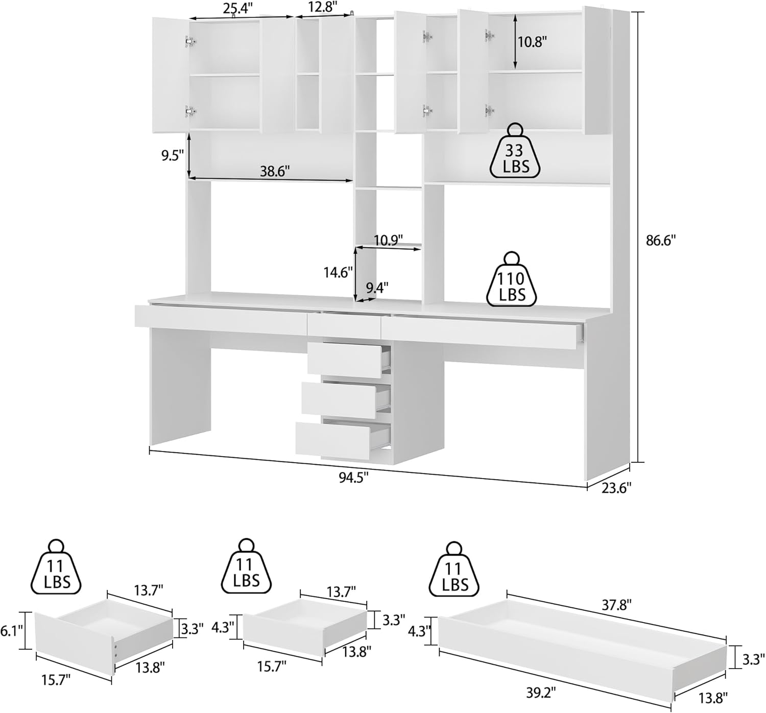 This WOODTIME home office desk comes with 2 desktops for 2 people. Great for you to work with your family, partner, and friends. This computer desk with drawers has plenty of legroom, while providing you with plenty of room to organize files, books, and tools for your work and study. You can also place decorations to create a personalized space and make work more fun. Overall dimensions: 23.6"D x 94.5"W x 86.6"H. P2 PB & MDF. Modern. White