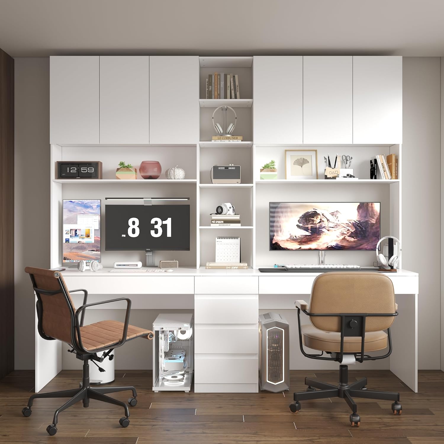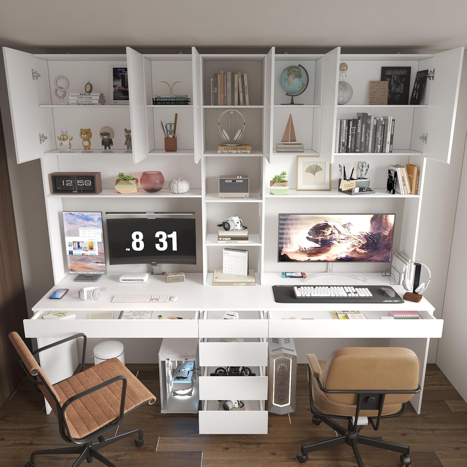 WOODTIME Large Two Person Computer Desk with Bookshelf, Study Writing Gaming Table Workstation with 6 Drawers & 15 Shelves for Home Office, White