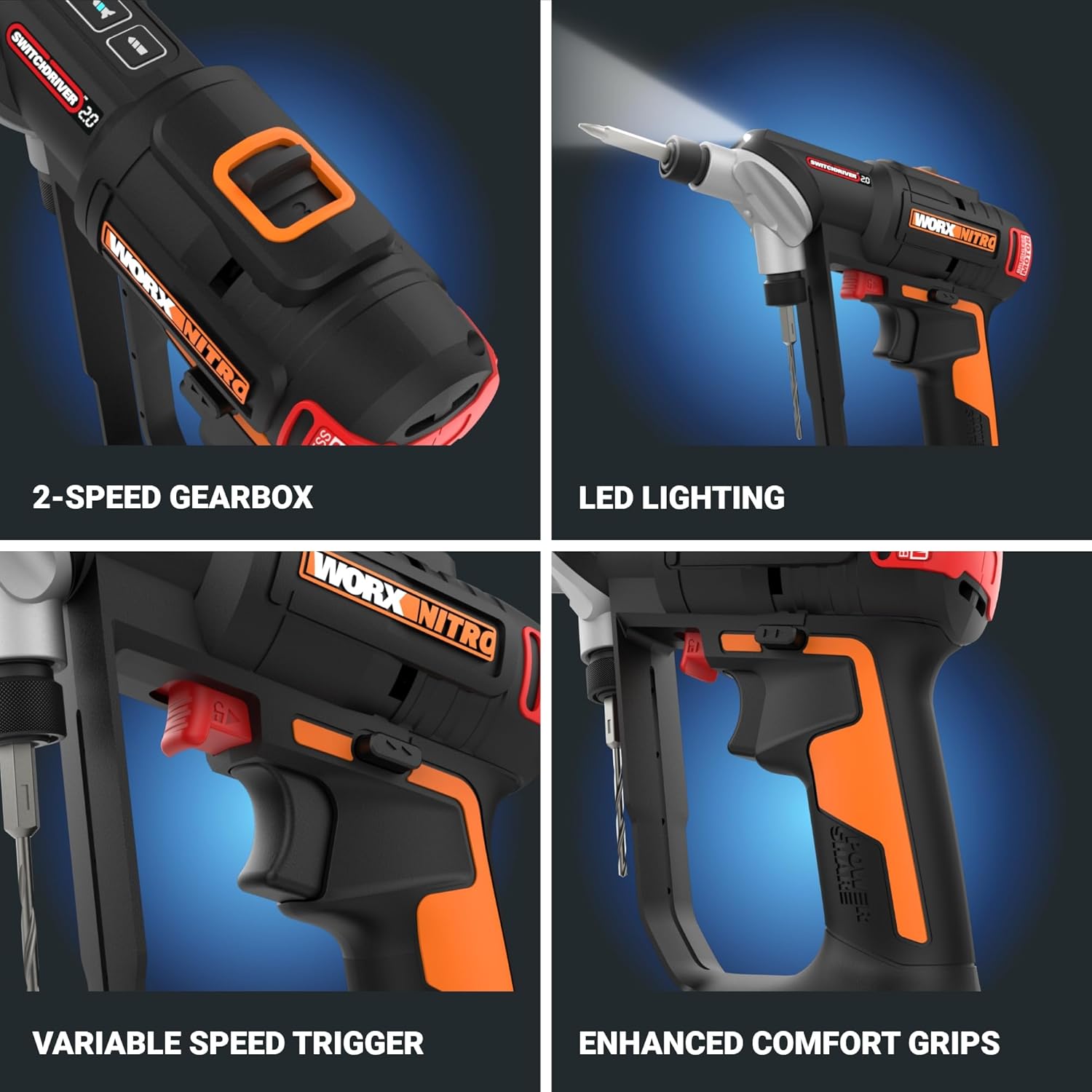 Introducing the all-new second generation Switchdriver 2.0 2-in-1 Drill/Driver. The original 20V Switchdriver has been a top selling Worx tool for years, but this new NITRO version takes the Switchdriver to the next level. New features and improvements include a powerful brushless motor, that offers 25% more power, 50% greater run time, and 10% longer life of the tool. Also featuring a new intelligent design interface with a digital keypad that allows you to quickly change torque settings (1-9) and adjust work mode between drilling and driving. This new version is also lighter and offers 442 in-lbs. of torque compared to the original version with 256 in-lbs. of torque. The variable speed trigger offers complete control and easy starting and the 2-speed gearbox allows for more advanced drilling and driving applications like driving longer lag bolts and drilling wider holes. The slim, ergonomic design with GripZone micro-texture allows for optimum comfort and reduced user fatigue. The new version features the same ¼” dual rotating chuck that made the Switchdriver one of the most innovative and useful Worx tools of all time. The 20V battery that powers this drill is the same battery that powers every lifestyle, outdoor power, and power tool in the Worx Power Share family. This drill is part of the Worx NITRO line of tools, a line of high-performance cordless tools that offer greater performance and run time than standard battery-operated tools, for users and applications that demand more from their tools.