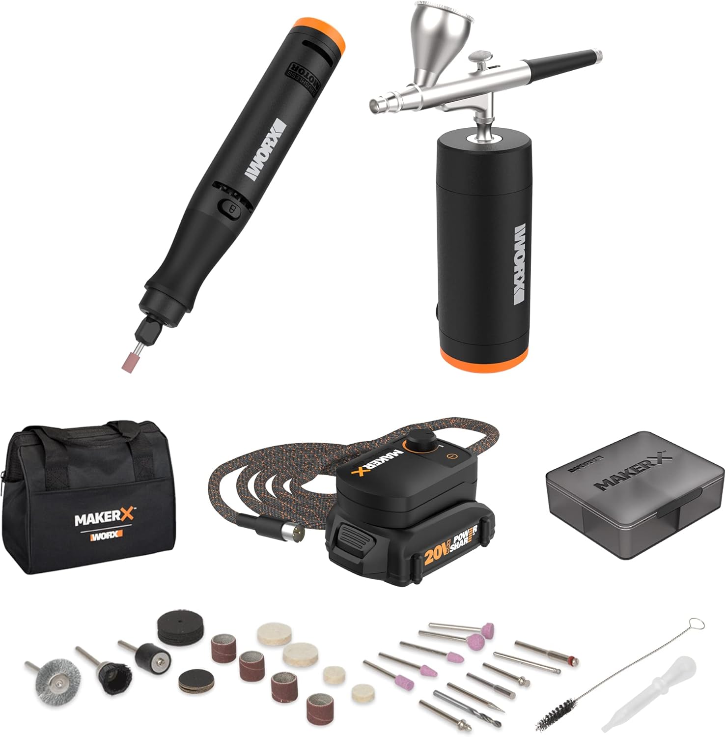 The 5-piece MAKERX Crafting Tool Deluxe Combo Kit gives you what you need to take on an enormous variety of projects, and to make them better than you ever could before. Whether you consider yourself a crafter, a hobbyist, a maker or a DIY-er, this crafting tool kit comes with 41 accessories to tackle your most ambitious projects yet. All MAKERX tools feature a Micro-Ergonomic Design that makes them easier to grip, so you can add an extra level of detail not possible with other, bulkier, crafting tools. And with the Hub portable power source, you don’t have to plug into the wall. Take your power with you and get to work anywhere. This deluxe crafting tool combo comes with an Angle Grinder and a Rotary Tool, both of which use compact brushless motors that that are more efficient, run 50% longer, are 25% more powerful, and have 10% longer life than comparable tools with brushed motors. The innovative Wood & Metal Crafter heats up fast and is both a wood-burning tool and a soldering iron, greatly increasing the type of projects you can do with this crafting tool kit. While the Mini Heat Gun and the Air Brush have precision nozzles so you can add a professional level of detail to your crafts. The only limit to your project prowess is your imagination, when you pick up the MAKERX Crafting Tool Deluxe Combo Kit. So go make something great.
