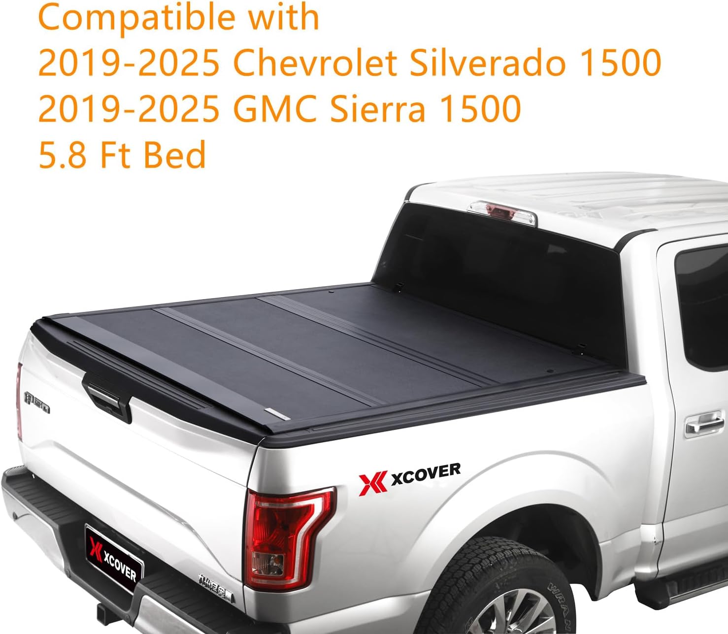 Xcover Low Profile Hard Folding Truck Bed Tonneau Cover, Compatible with 2019 2020 2021 2022 2023 2024 2025 Chevrolet Silverado/GMC Sierra 1500 5.8 Ft Bed
