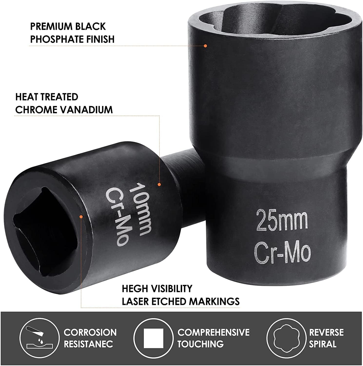 Permanent laser-etched size markings on each socket set, Easy to use for you , and quickly find in dim light.