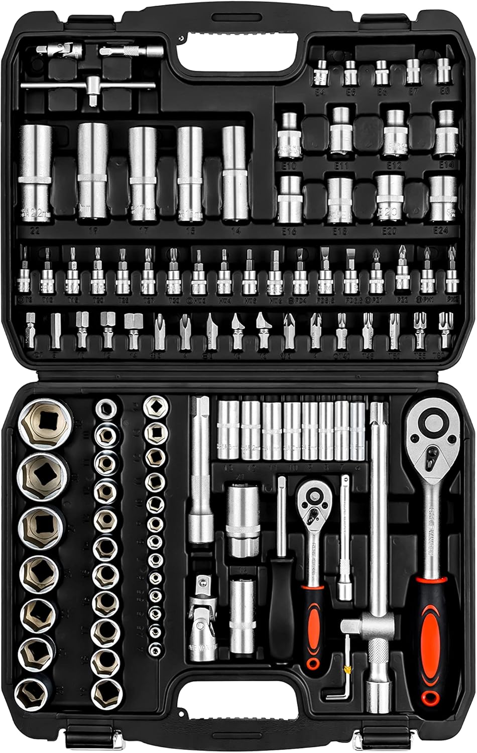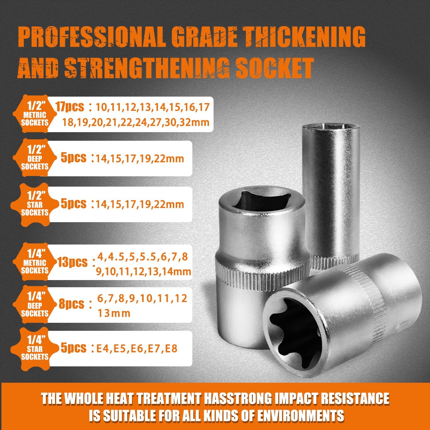 XHTT Mechanics Tools Kit,108-Piece 1/4"&1/2 Metric And Standard Socket Set,Ratchet Set,Quick Release Reversible Ratchet Wrench,Universal Joint,Extension Bars.