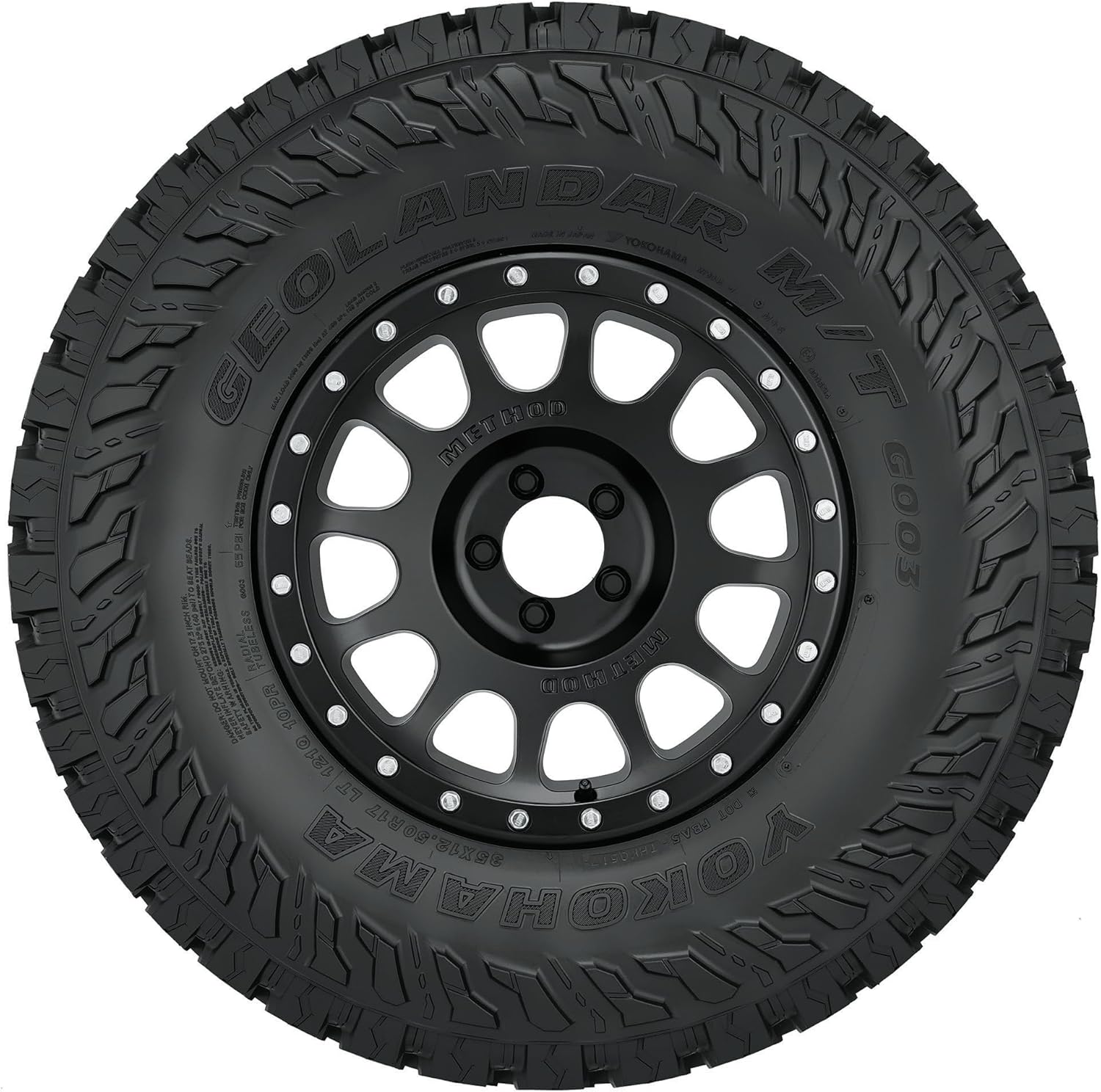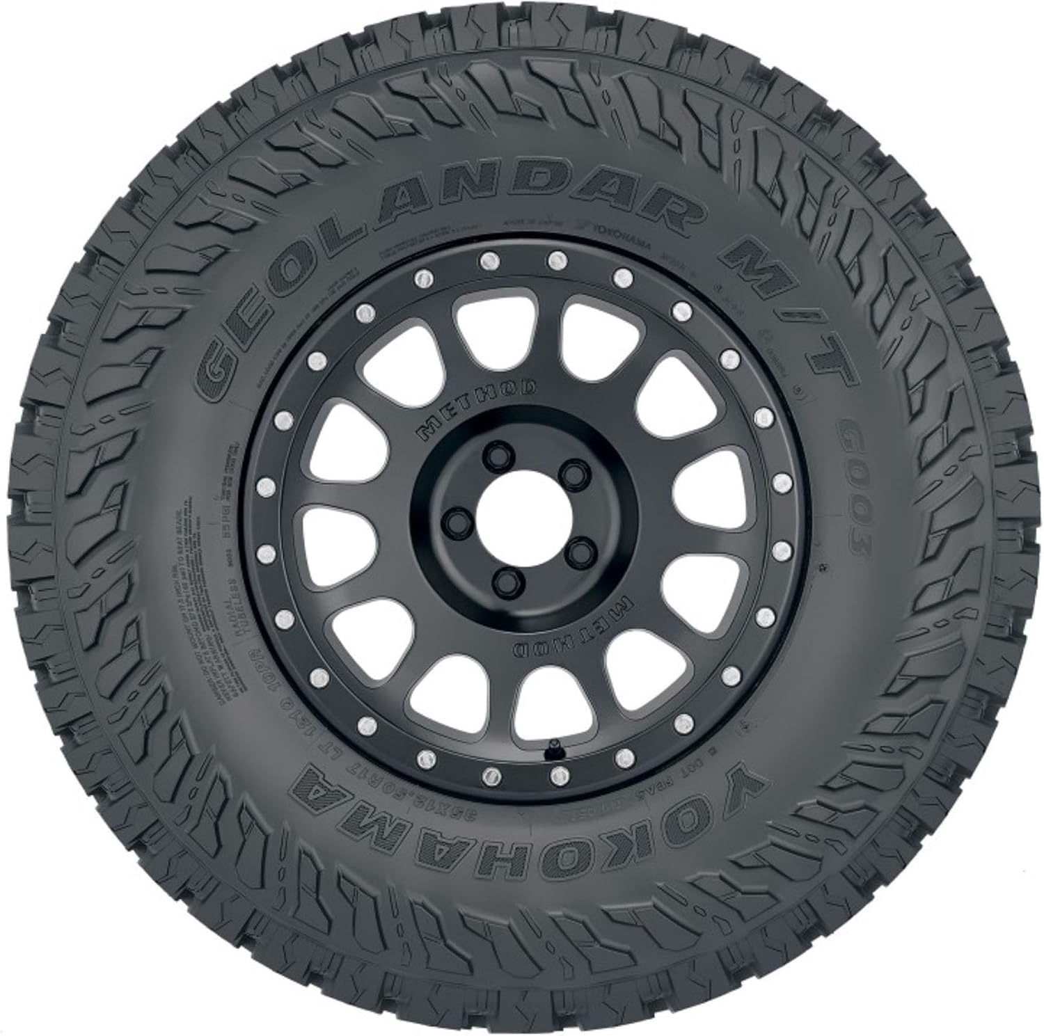 The Yokohama Geolandar M/T G003 is a mud-terrain tire that's designed for SUVs, crossovers, and pickup trucks, and features an aggressive tread pattern for superb grip and traction and GEO-SHIELD technology that protects its casing and tread for longer tread life. While optimized void ratio and sipes provide shorter stopping braking distances and increased grip, the mud and stone ejectors clear tread consistently to limit stone drilling and improve traction. Protecting the mud-terrain tire are the sidewall armor and GEO-SHIELD technology that features a high turn-up carcass, a full nylon cap, and multiple sidewall plies. Backed by Yokohama's 30-day satisfaction guarantee, the Geolandar M/T G003 is available in different sizes such as 15, 16, 17, 18, 20, 22, and 24 inches.