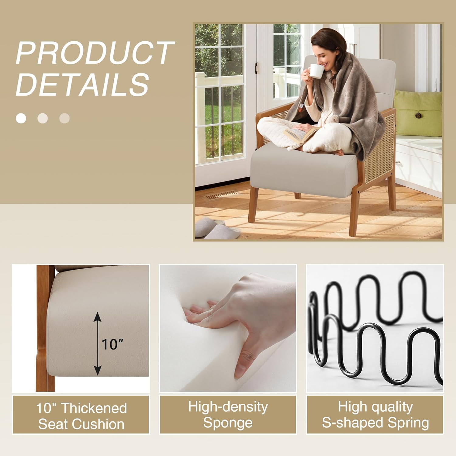 Yongchuang Beige Accent Chairs Set of 2 Upholstered Living Room Chairs with Natural Rattan Arm, Modern Faux Leather Arm Chairs for Bedroom Club Reception