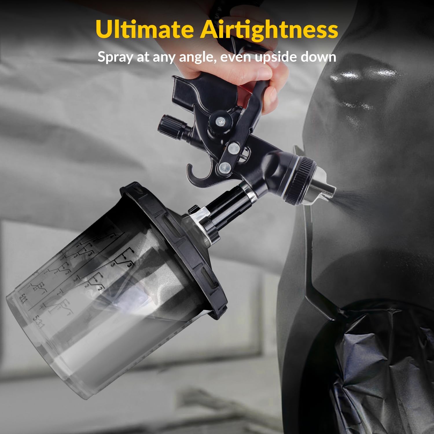 The paint cup liner and lid are molded precisely for a perfect fit and airtight seal. To enhance this, we recommend using sealing tape around the lid interface and spray gun paint inlet threads for an ideal seal.