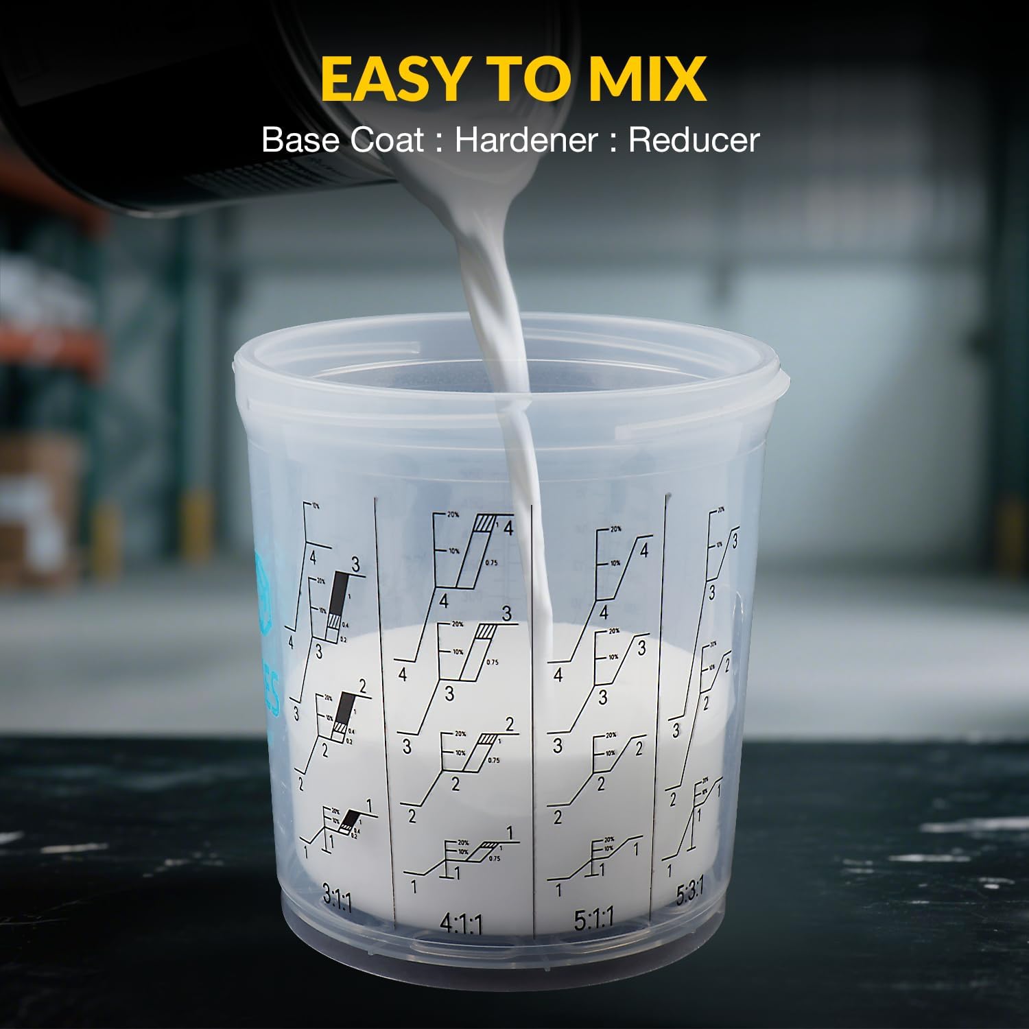 YUZES Paint Mixing Cups System 20 Ounce (600ml), 50 Disposable Paint Cups Liners and Lids, 2 Hard Cup with Retainer Ring, 20 Plugs, PTFE Tape, Paint Stirrer, 2 Cup Adapter for Automotive Paint Gun